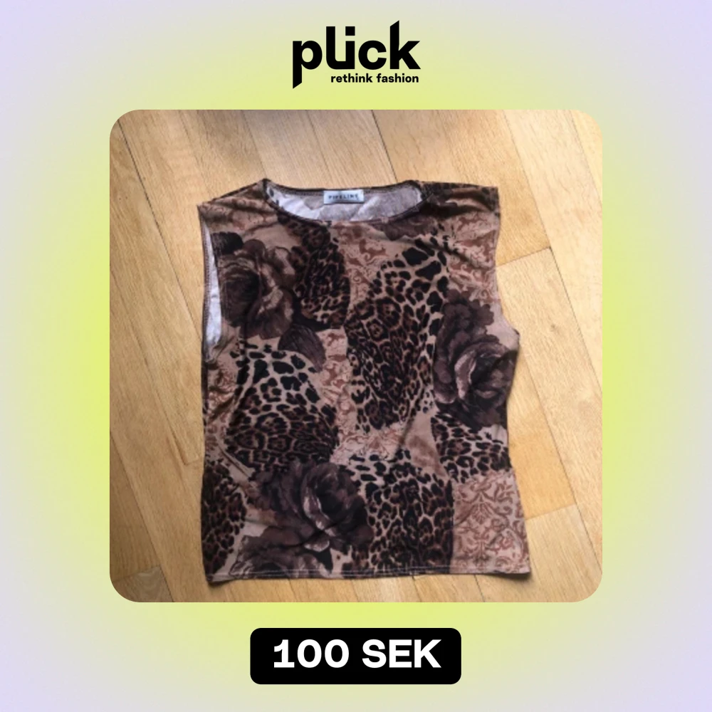 En ärmlös topp med ett unikt mönster som kombinerar leopard och blommor i olika nyanser av brunt och beige. Toppen har en rund halsringning och är tillverkad i ett mjukt material.