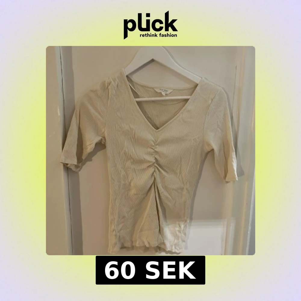 Säljer en beige ribbad topp från Part Two i storlek S. Toppen har v-ringning, korta ärmar och snygg snörning framtill som ger en cool rynkad effekt. Materialet är mjukt och stretchigt, perfekt för dig som gillar en slim passform och stilren look.
