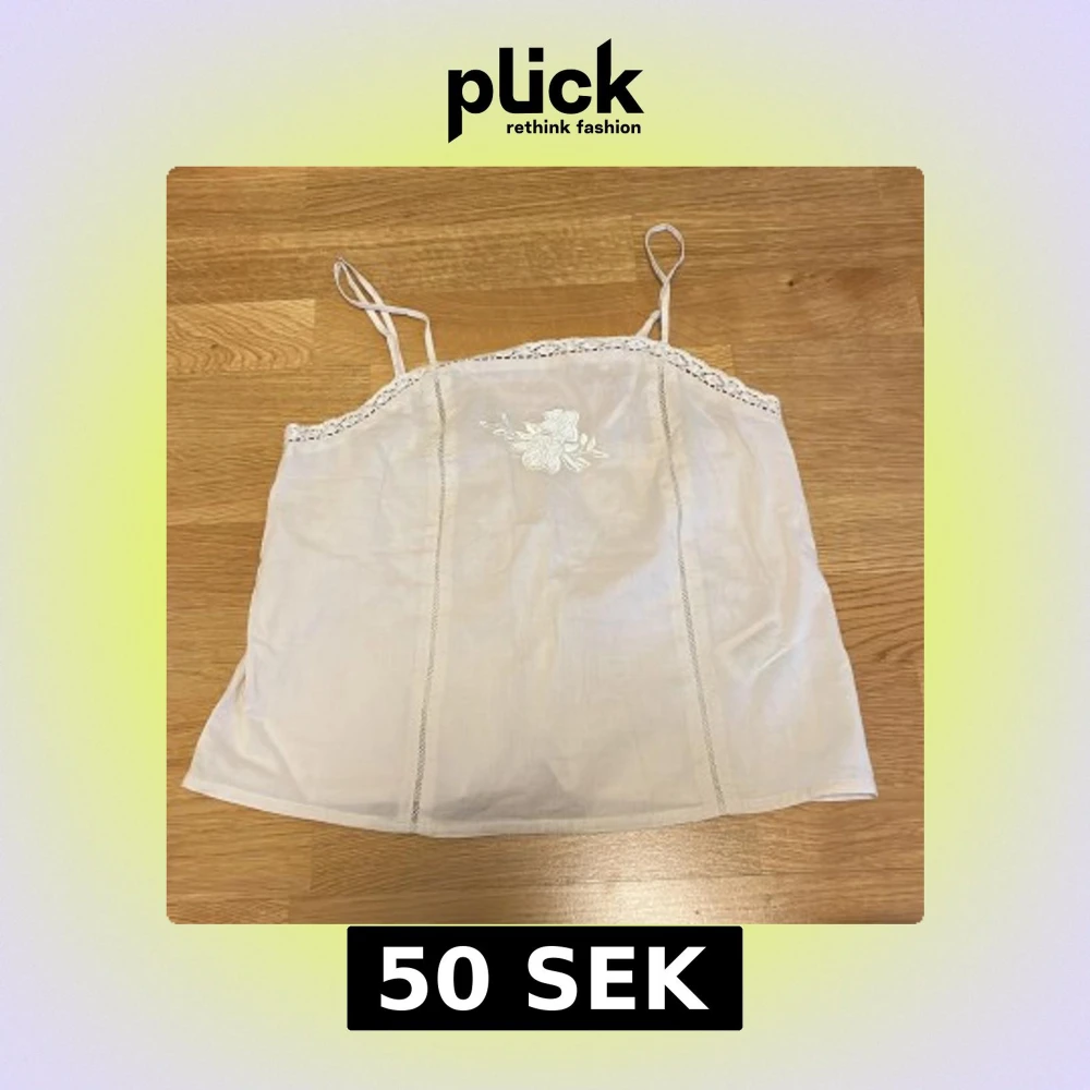 Säljer ett sött, vitt, blusliknande linne med smala axelband och spetsdetaljer längs kanten. Aldrig använd och är i storlek S. Säljer för 50 kr exklusive fraktkostanden.🩷