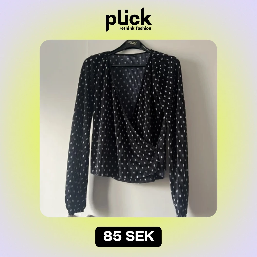 Säljer en superfin svart omlottopp från Gina Tricot i storlek XS. Toppen har ett prickigt mönster i vitt och långa ärmar. Perfekt för både vardag och fest! 🖤