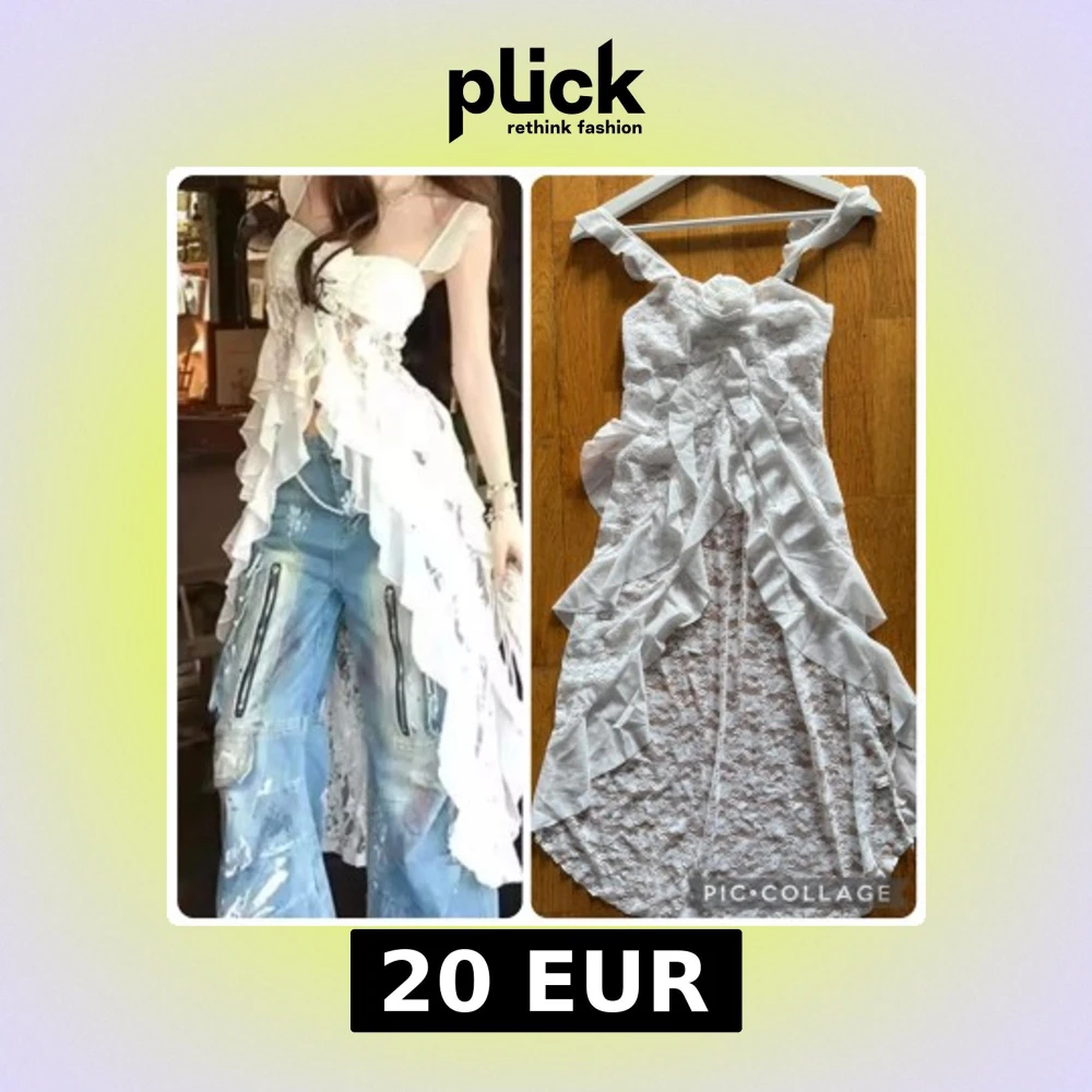 Supersöt vit klänning i spets med volanger längs hela framsidan och en stor tygros vid bysten. Klänningen har smala axelband, omlottkänsla och är längre bak än fram. Perfekt för dig som gillar romantisk och unik stil.