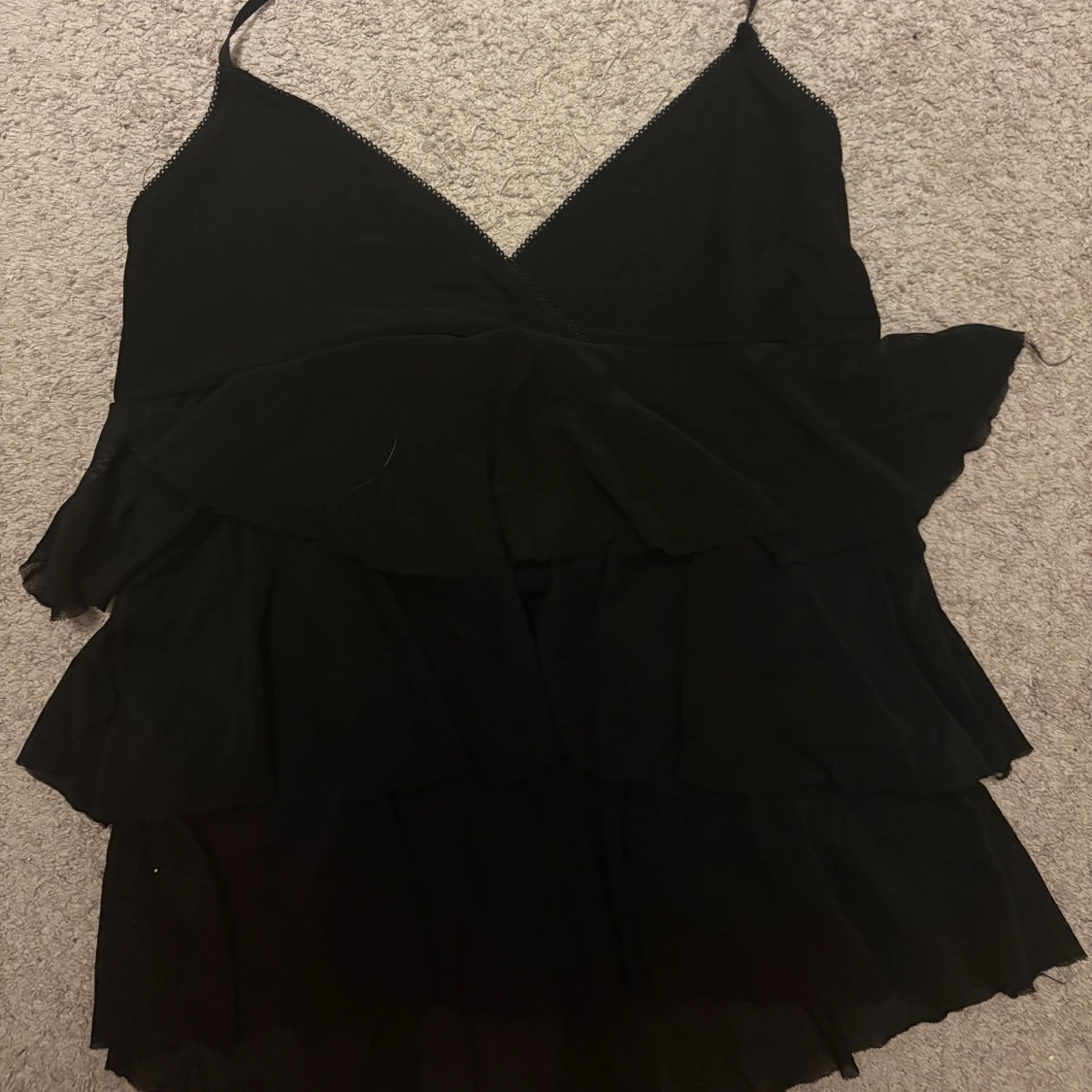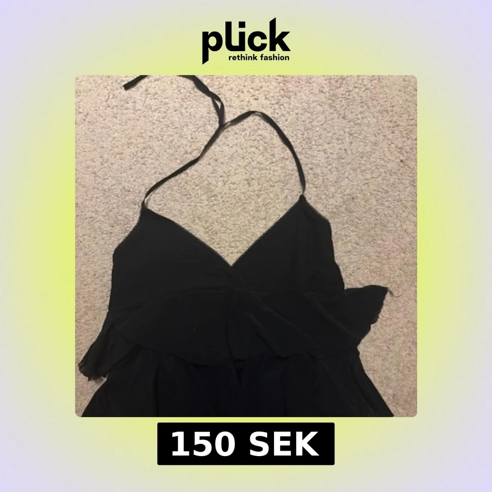 Supersöt svart halterneck med smala axelband som knyts i nacken och v-ringad omlott framtill. Tröjan har flera lager volanger som ger en flowy och lekfull känsla. Perfekt för dig som gillar en feminin och trendig stil.