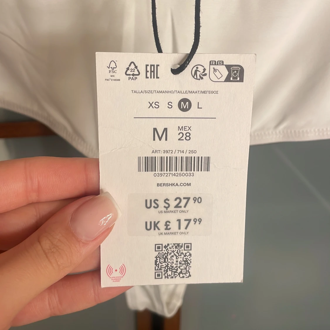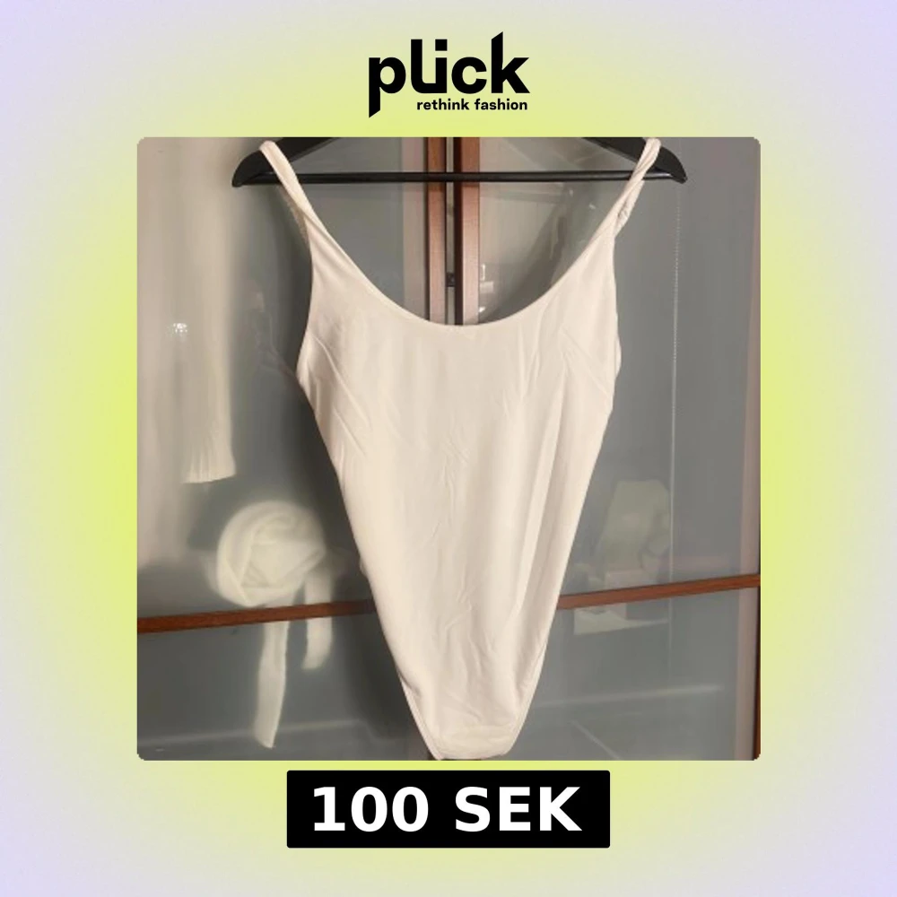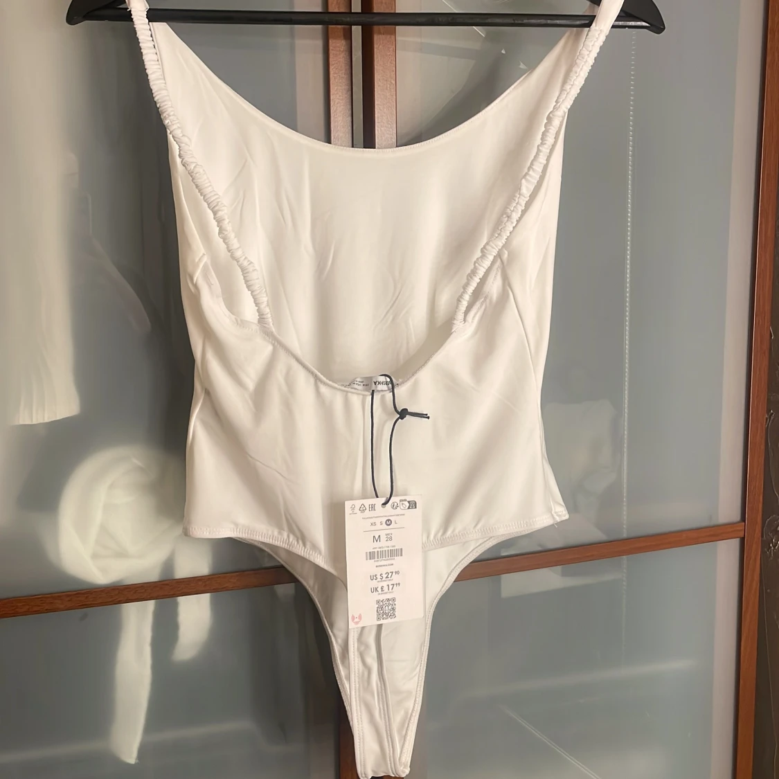 Snygg vit body från Bershka i storlek M. Modellen har smala axelband med rynkade detaljer och djup rygg. Enkel och stilren design. Aldrig använts.