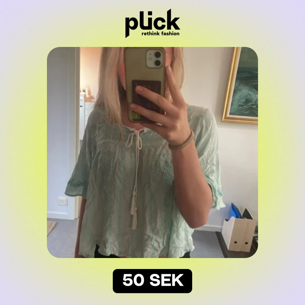 Säljer en söt ljusgrön blus med knytband framtill. Den har korta ärmar och en lös passform, perfekt för varma dagar. Blusen är i ett lätt och luftigt material, vilket gör den superbekväm att bära.
