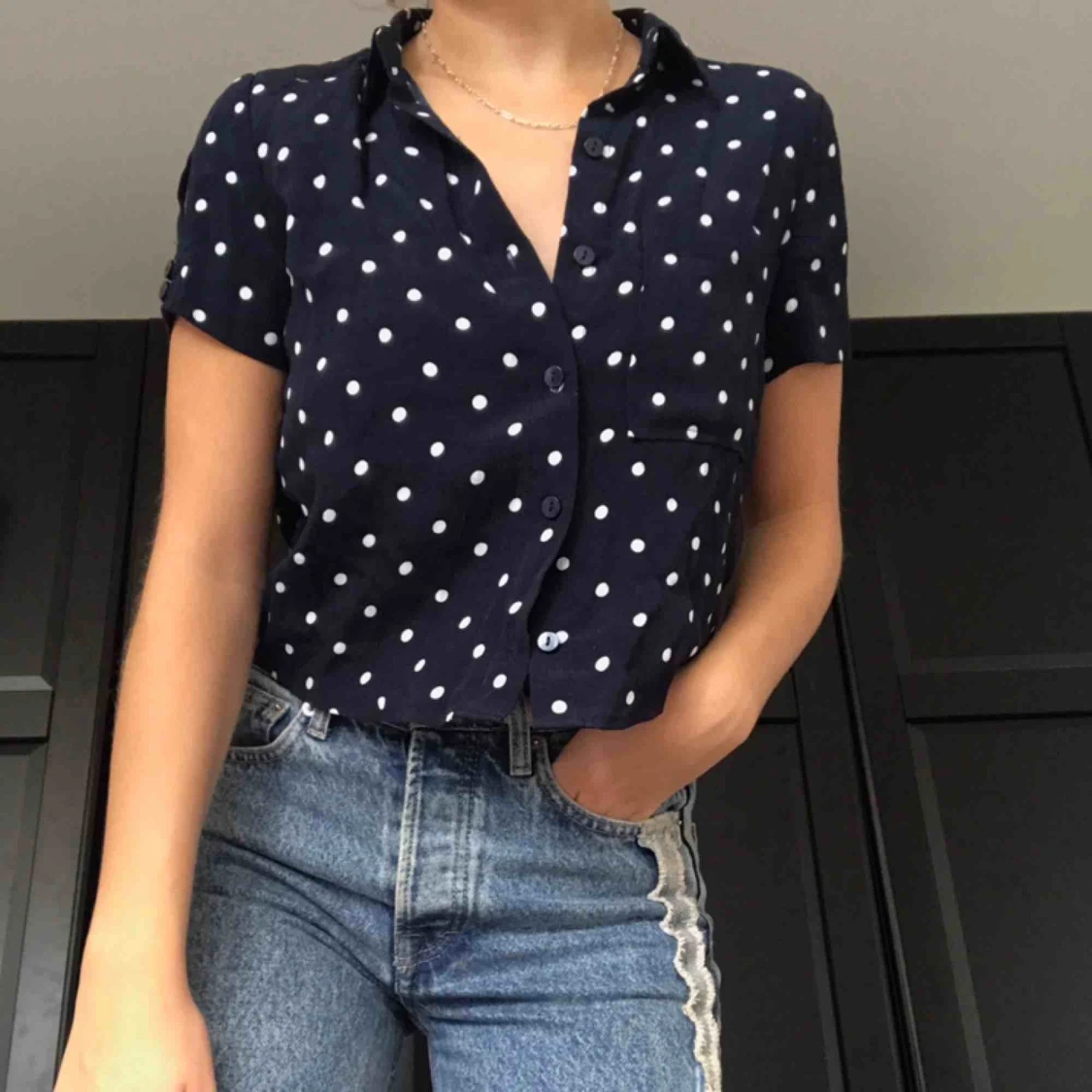 Jättefin kort blus/topp med liten krage. Mörkblå med vita prickar och knappar upp🌚