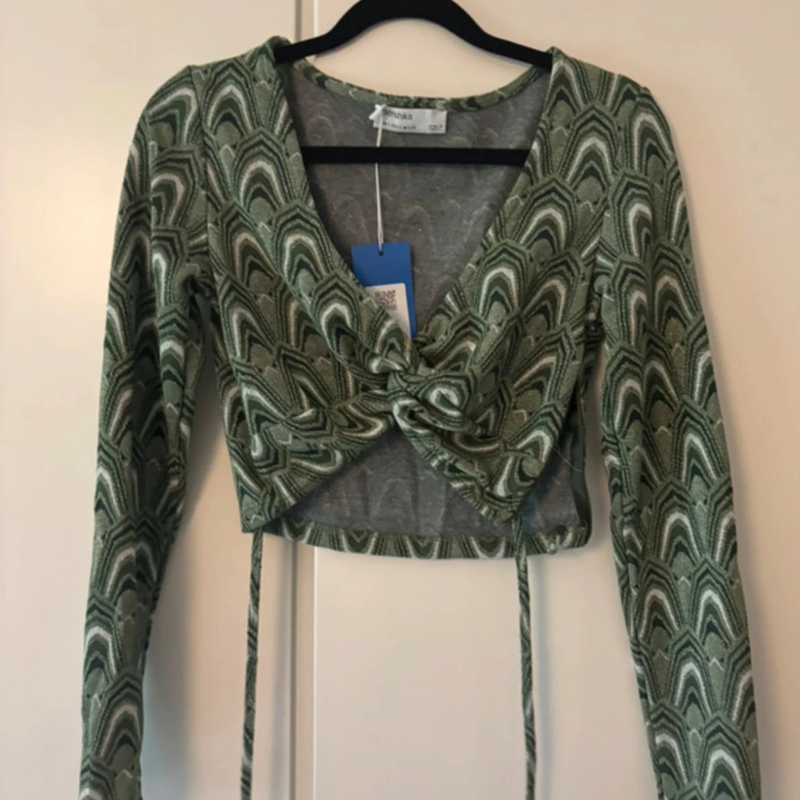 Säljer en grön långärmad croppad topp från Bershka med coolt grafiskt mönster. Toppen har v-ringning, knytning framtill och långa band som hänger ner. Perfekt för dig som gillar trendiga detaljer och snygg passform.