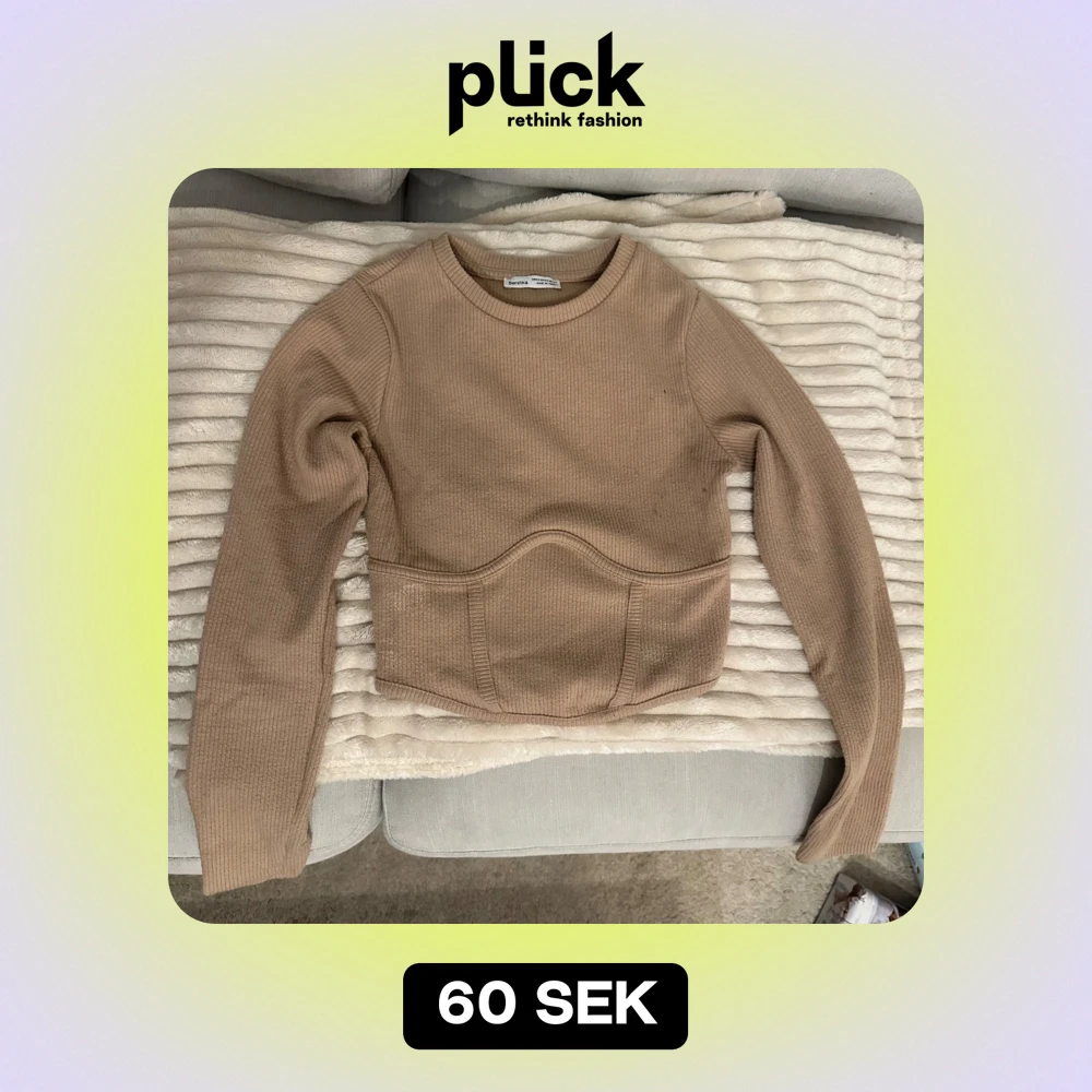 Säljer en snygg beige ribbad kort/magtröja. Tröjan har en unik design med en markerad midja och långa armar. Lite liten i storlek.