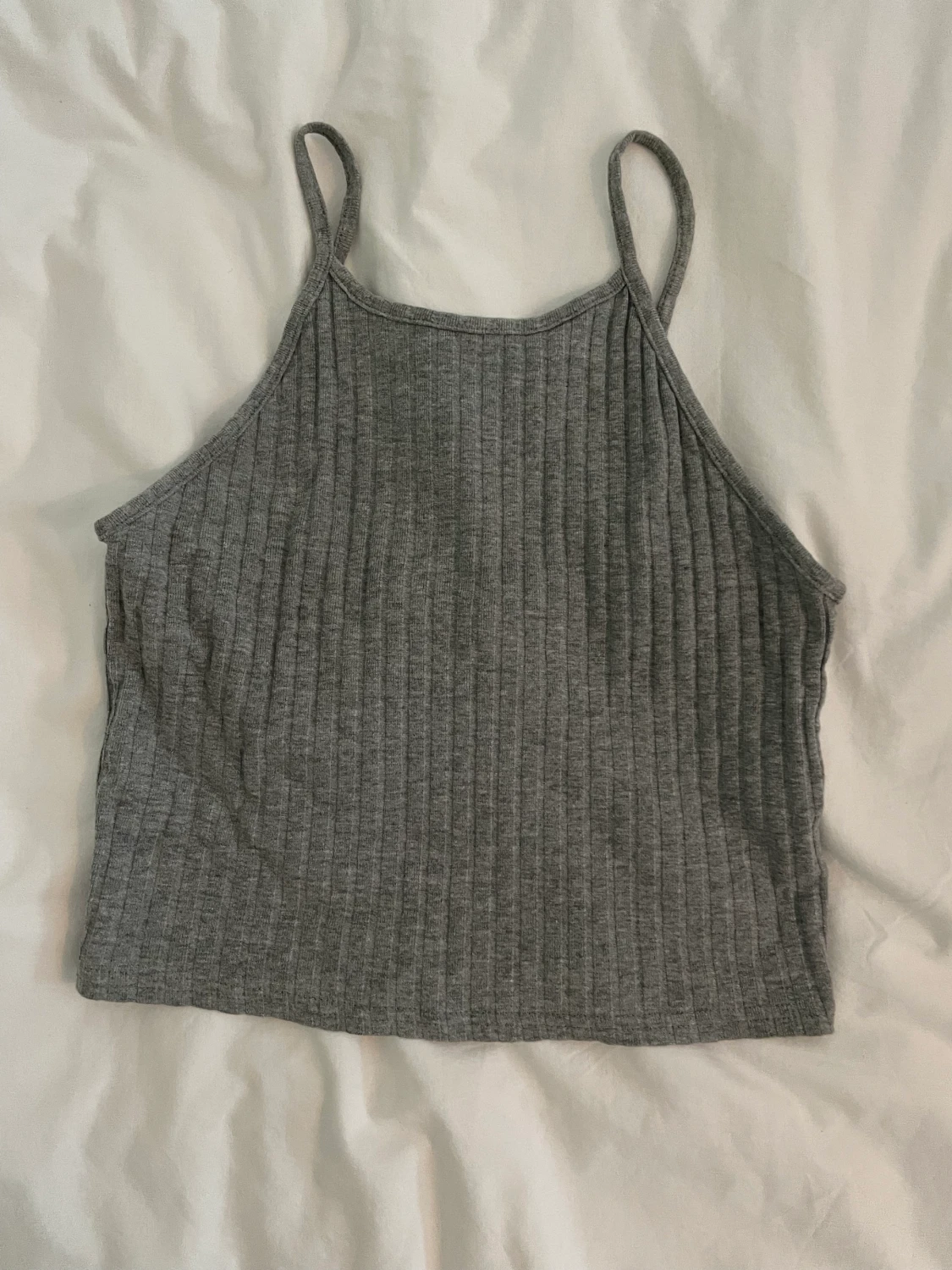 Grå croppad topp, ganska låg i ryggen