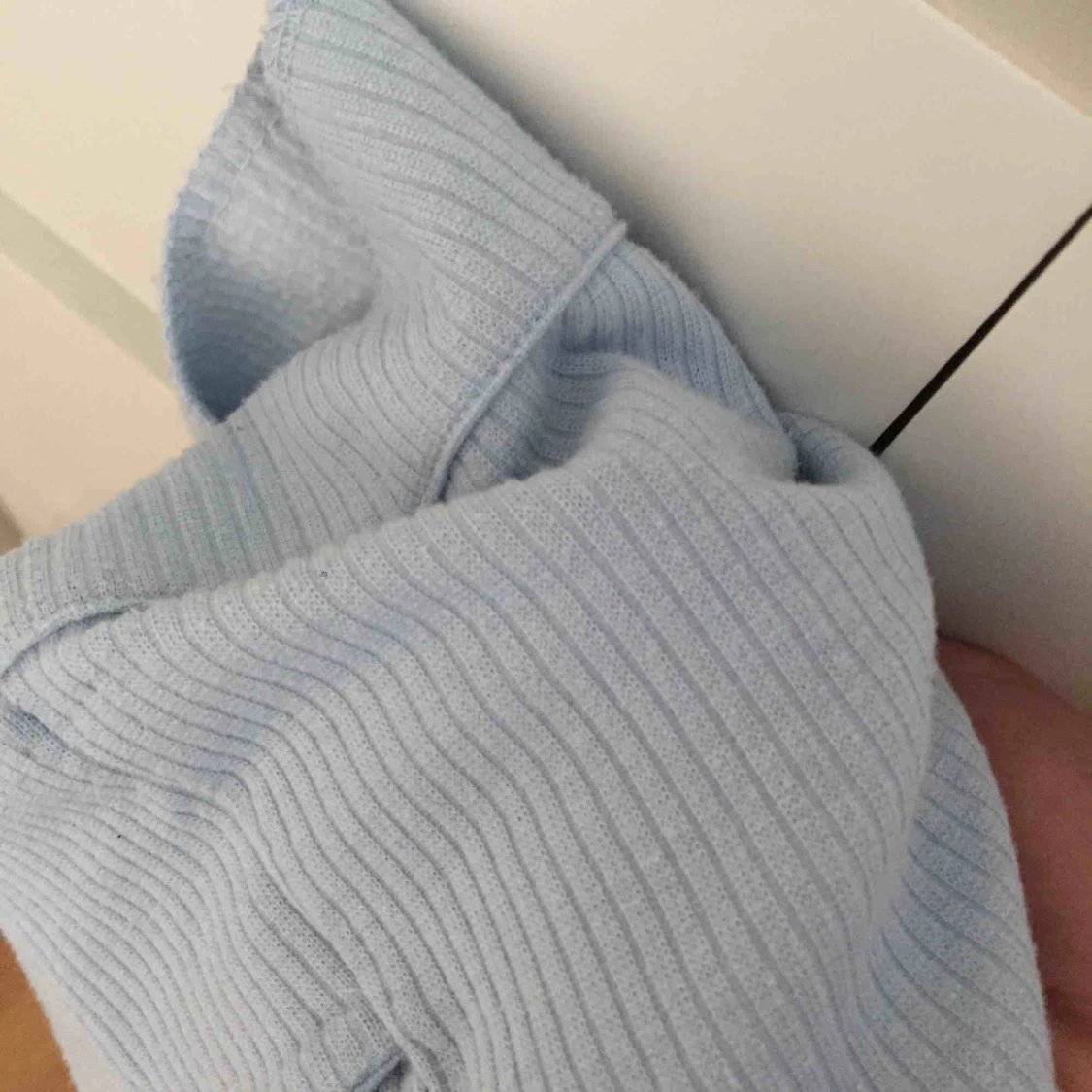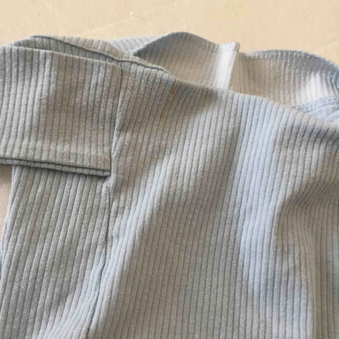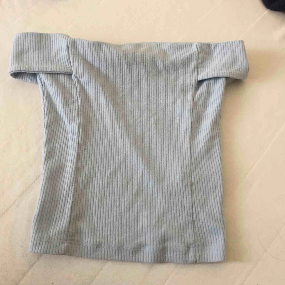 Baby blå off shoulder tröja. Sitter jätte fint på med sömmer som framhäver midjan fint. den har några små fläckar som jag tror kan gå bort med något medel men därav det billiga priset.