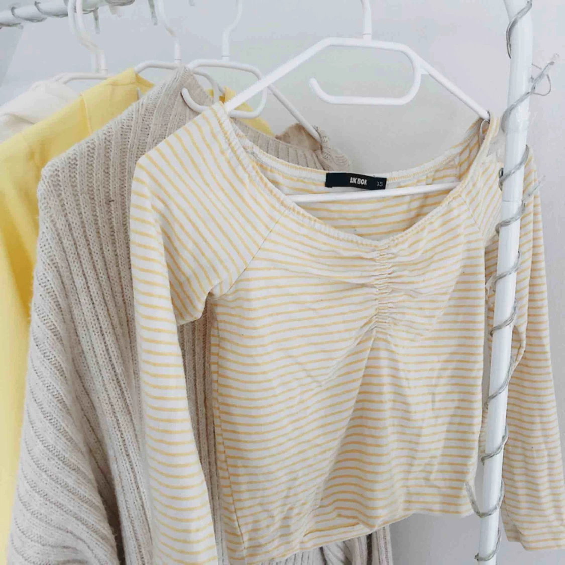 Jättesöt gul-vit-randig topp med en superfin söm-detalj mellan brösten! Verkligen gullig!💛 Säljer pga att jag har tyvärr växt ur den💛 Går både att ha off-shoulder och även precis ovanför axlarna.