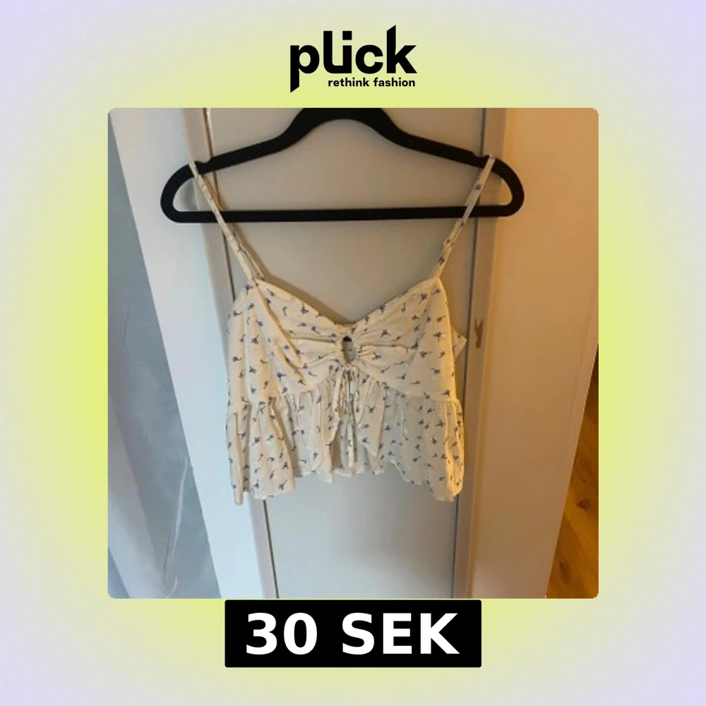Ljus linnetopp med blått blommönster och smala axelband. Toppen har en söt volangkant nertill och snörning framtill som ger en fin detalj. Perfekt för varma dagar och somriga outfits.