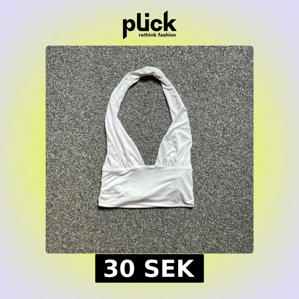 Snygg vit halterneck linnetopp med djup v-ringning och bred resår under bysten. Toppen är ärmlös och har en stilren, minimalistisk look som passar perfekt till sommarens outfits.