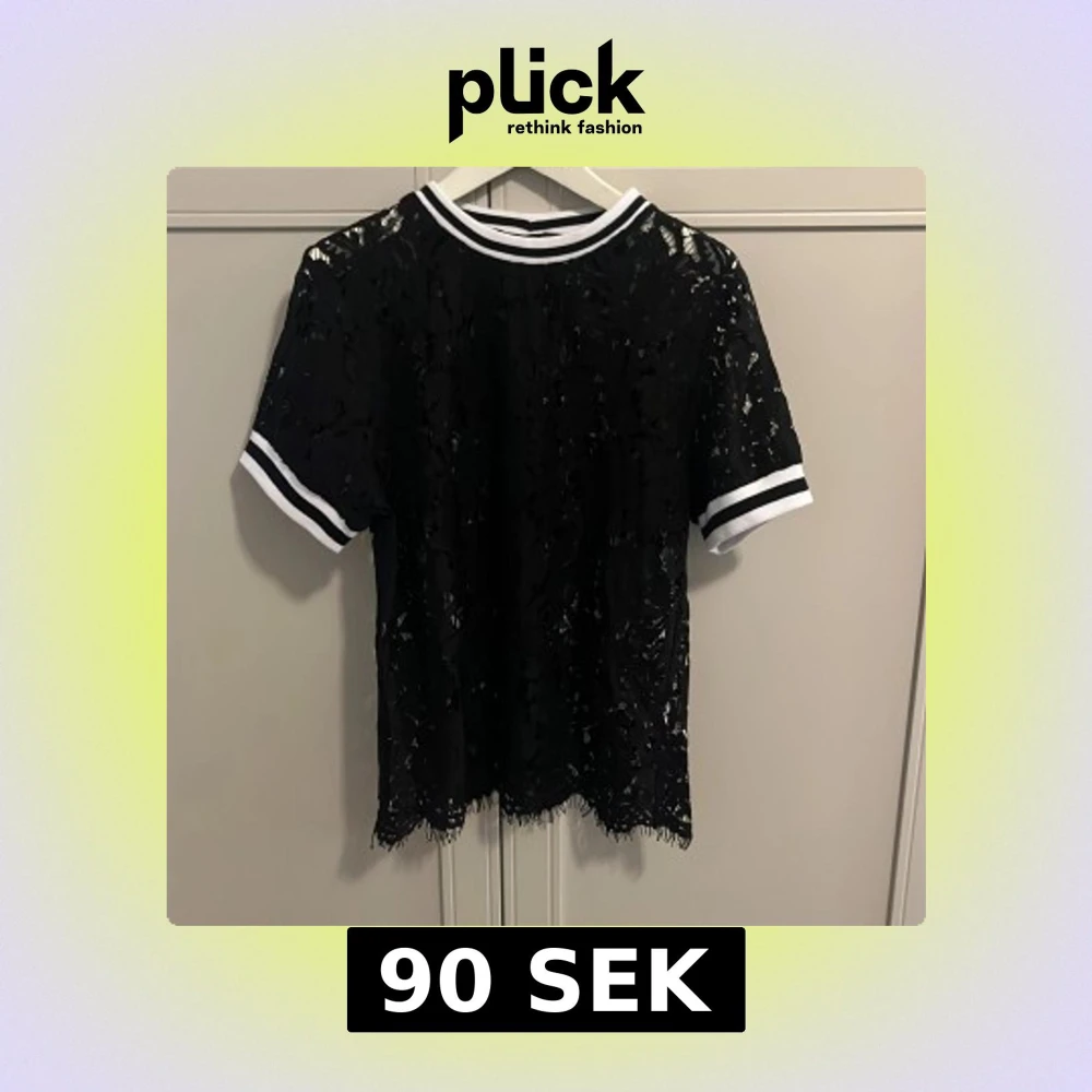 Säljer en svart t-shirt i spets med vita ränder på ärmslut och krage. T-shirten är genombruten och har korta ärmar. Perfekt för dig som vill ha en cool och trendig look går att ha över ett linne under eller liknande toppen är i L men passar alla storlekar.