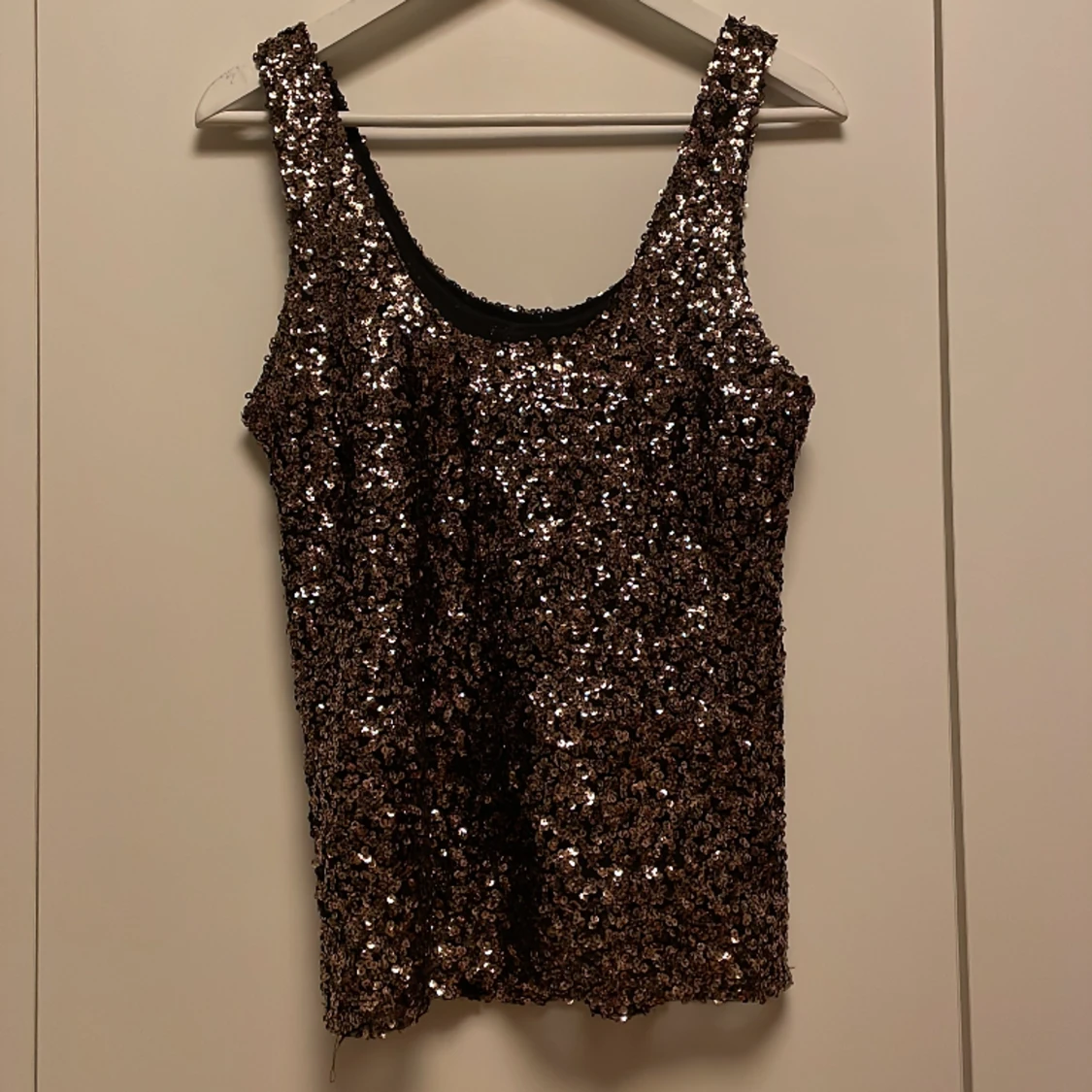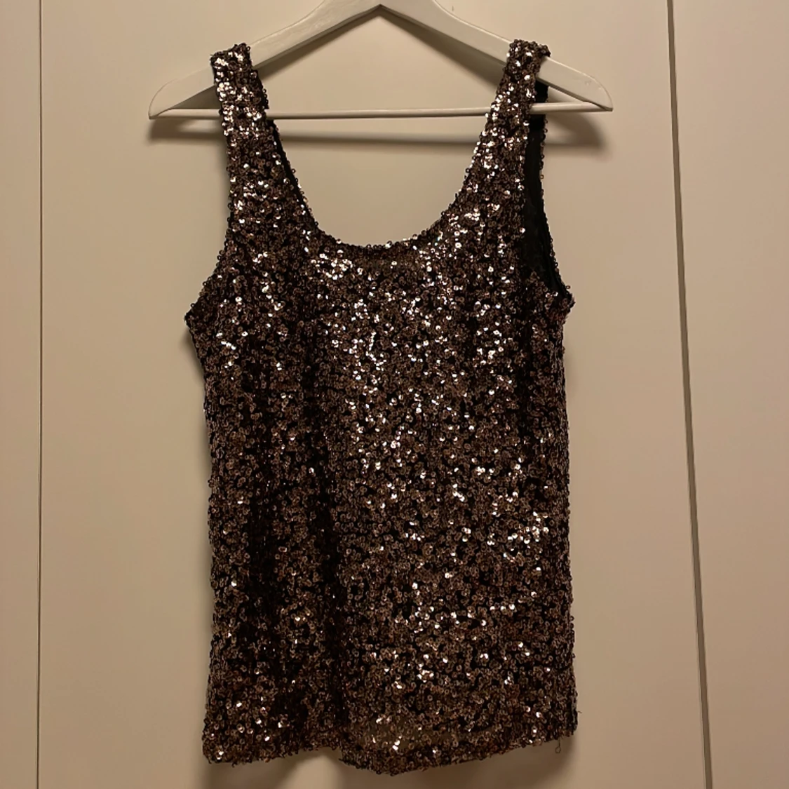 Fint glittrigt linne i brun/guldfärg Köpt på Vinted men i bra skick! Säljer då det tyvärr inte passa mig
