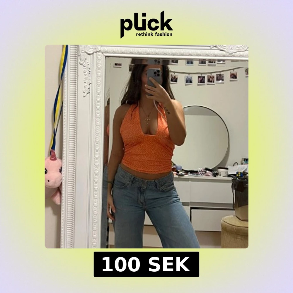 Säljer en snygg orange halterneck topp med vita prickar. Toppen är ärmlös och har en djup urringning samt öppen rygg. Perfekt för sommardagar och ger en fräsch look.