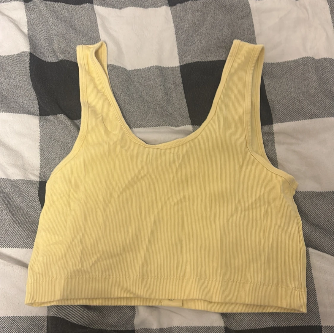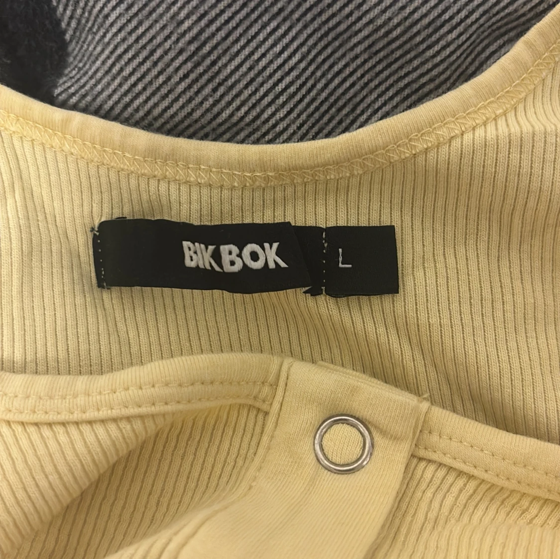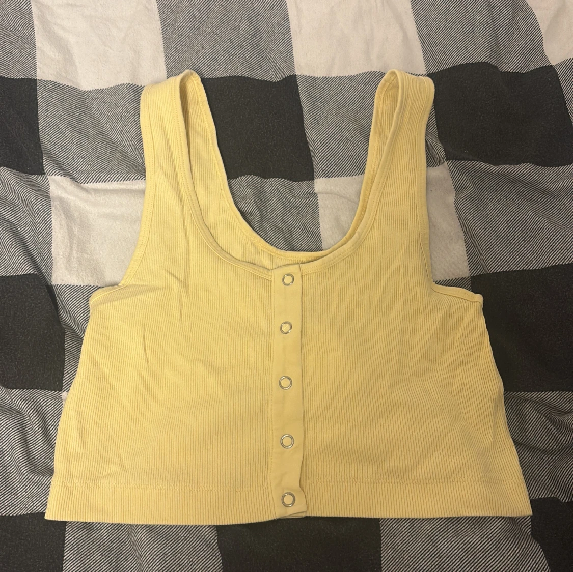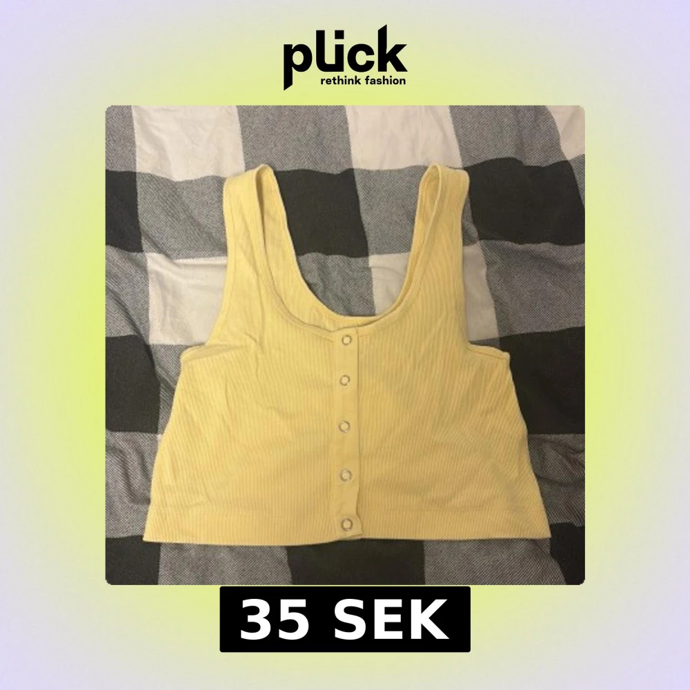 Snygg ljusgul croppad linnetopp från Bik Bok med ribbad struktur och tryckknappar framtill. Toppen är ärmlös och har en rundad halsringning. Perfekt för varma dagar och enkel att matcha med jeans eller kjol.