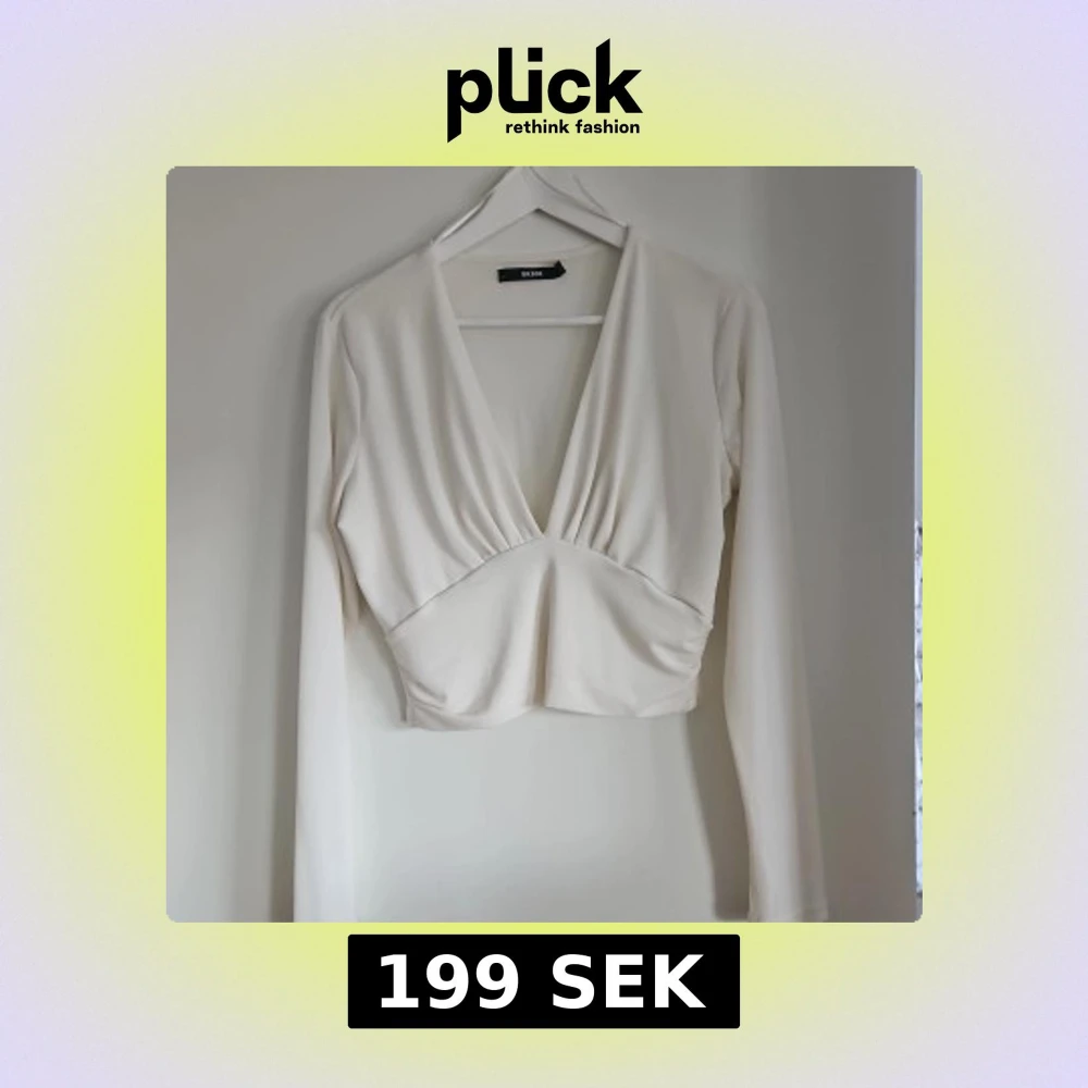 Säljer en stilren vit croppad topp från Bik Bok med djup v-ringning och långa ärmar. Toppen har en snygg omlott-effekt framtill och är tillverkad i mjukt material som sitter bekvämt. Perfekt för dig som gillar minimalistisk och trendig stil.