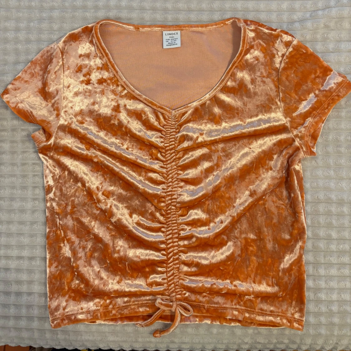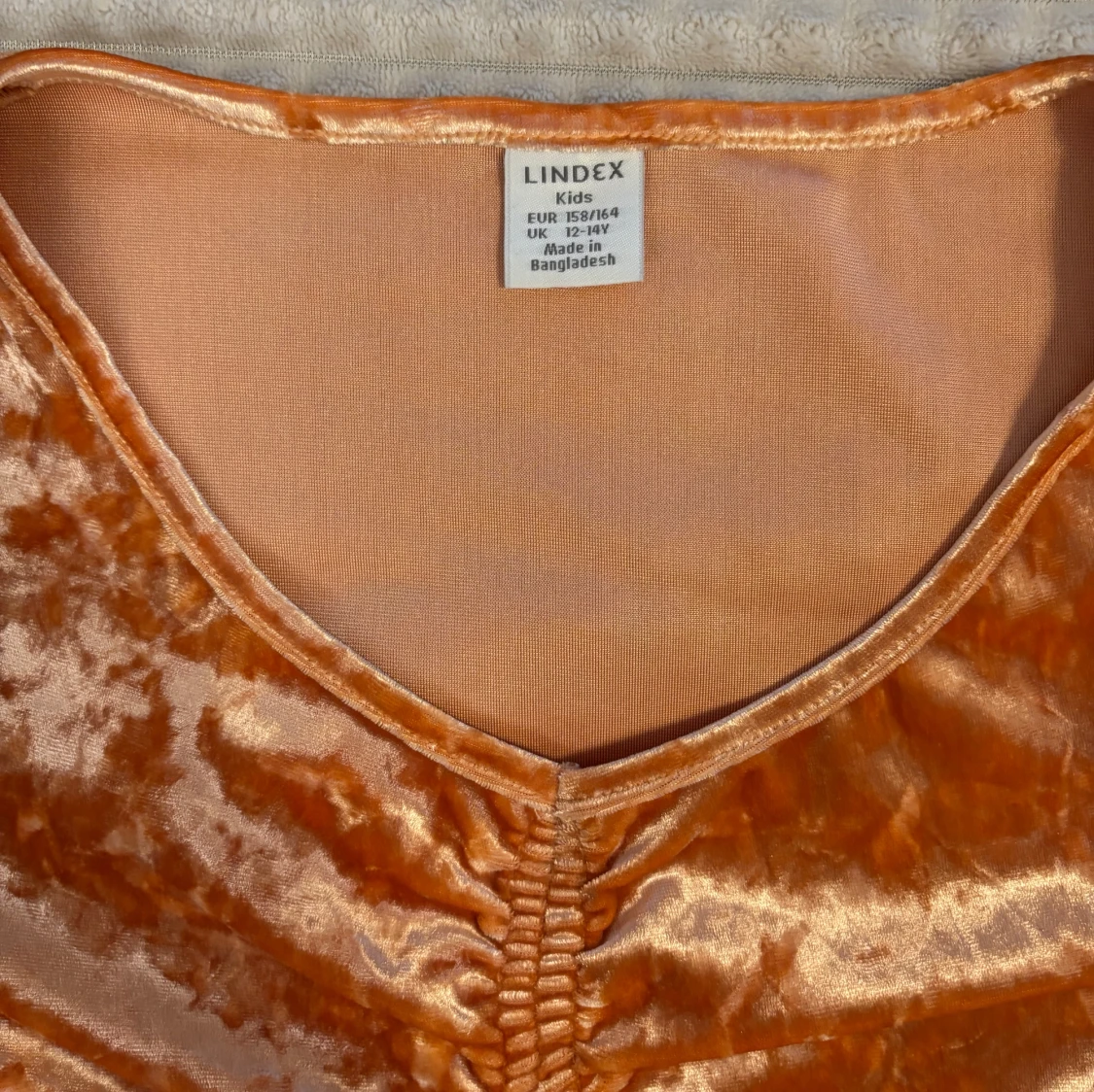 Superfin orange topp i glansig sammet från Lindex. Passar Xs. Ej använd på flera år.