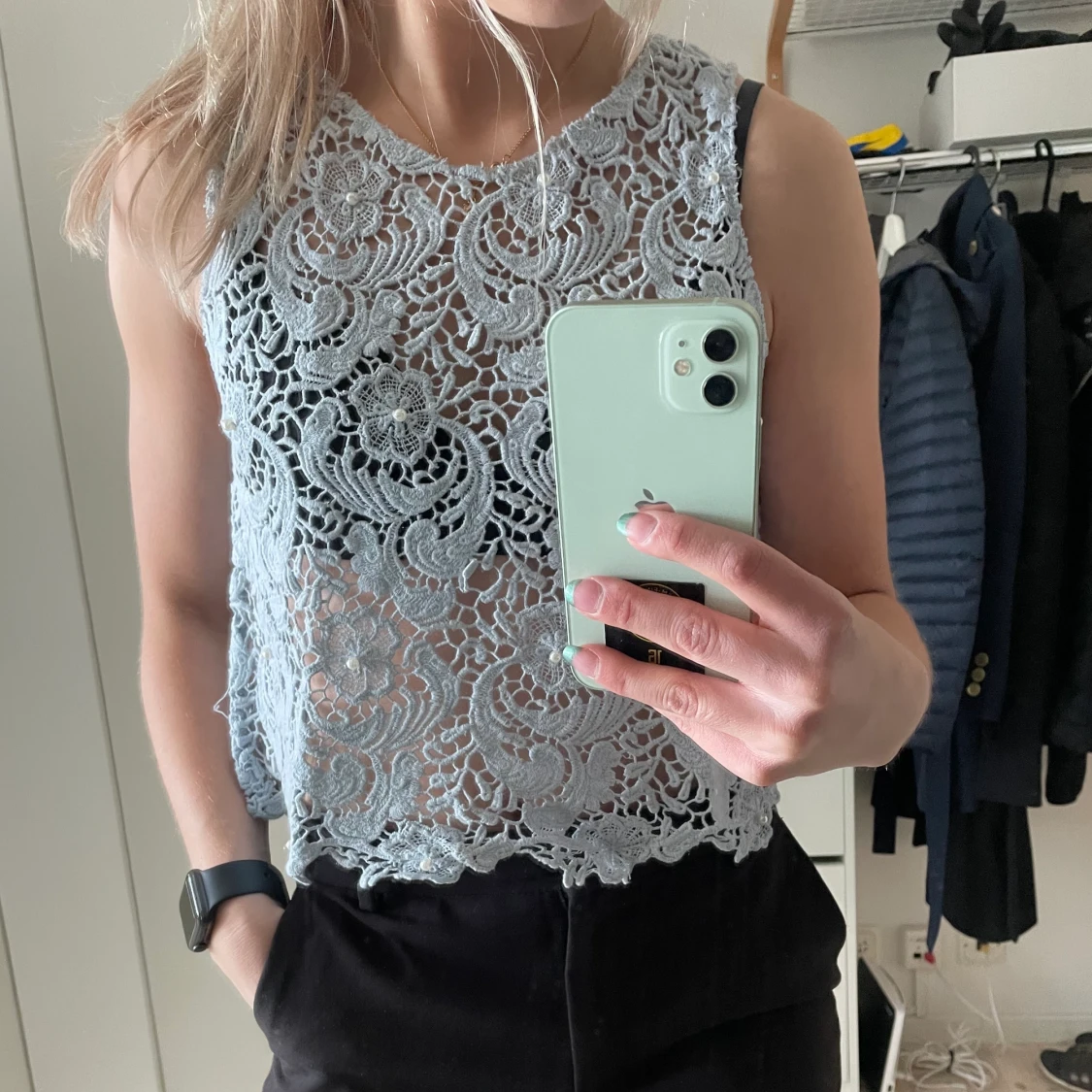 Ljusblå mönstrad topp med pärlor som detaljer.