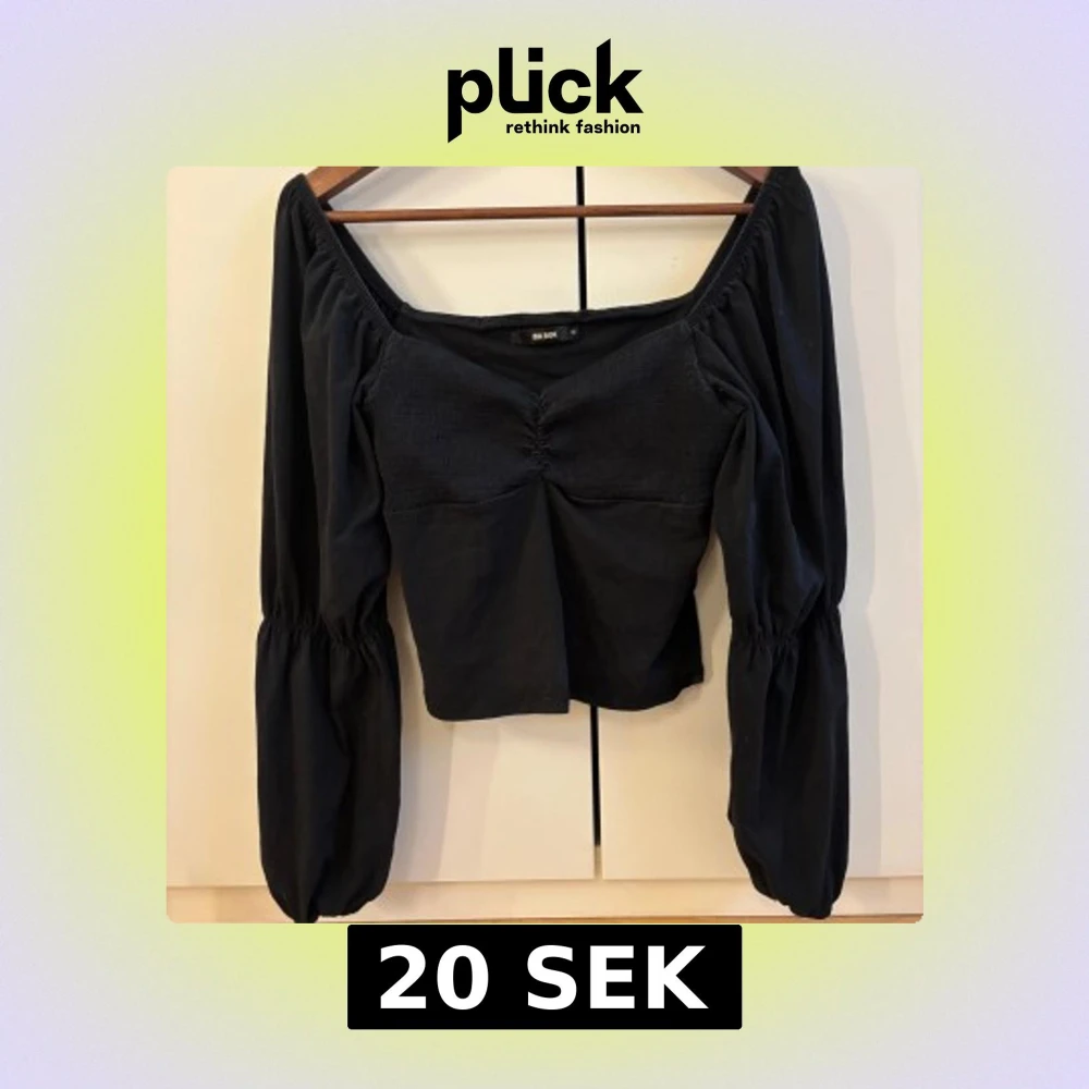 svart blus med bred, fyrkantig urringning och puffiga långärmar.