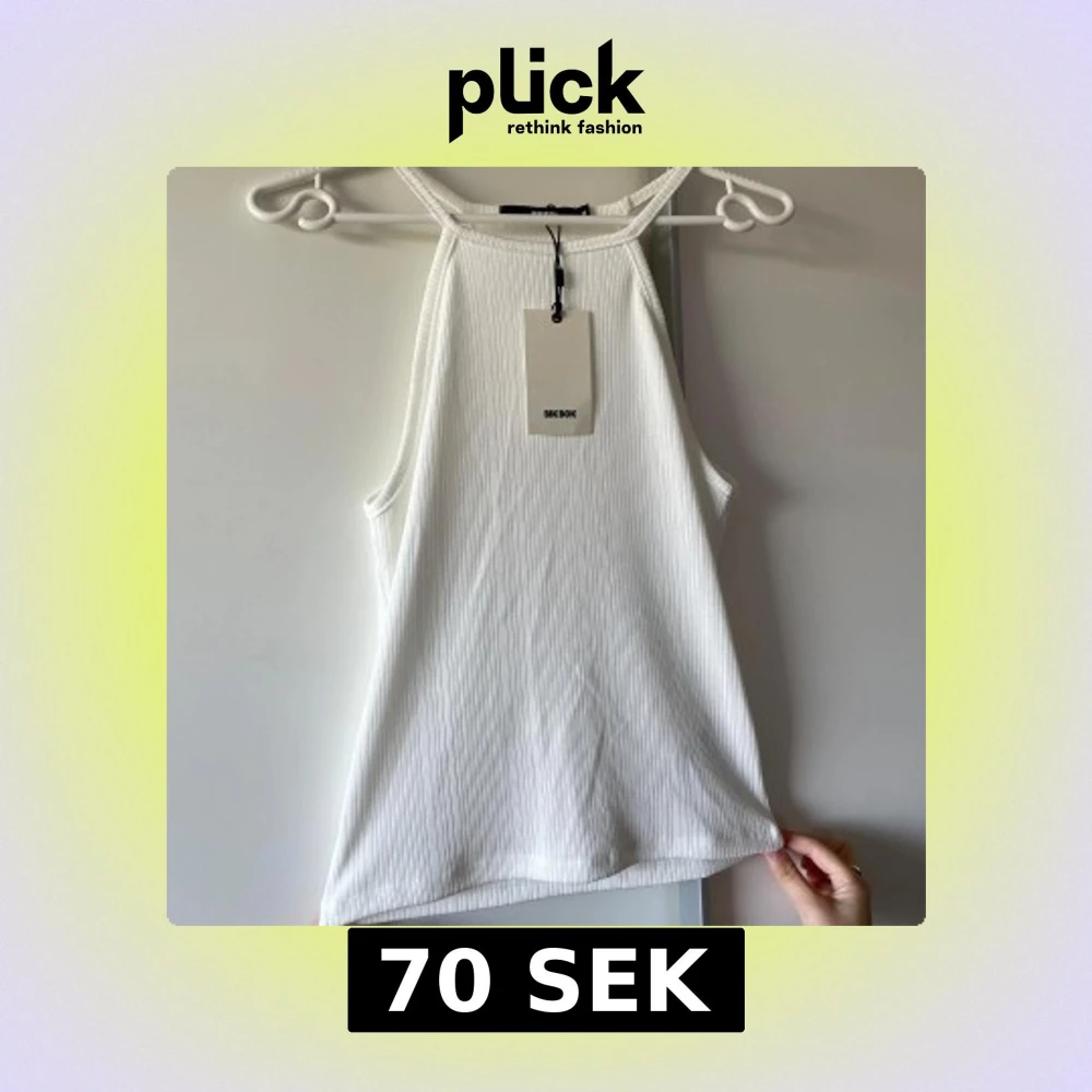 Snygg vit ribbad linnetopp från Bik Bok med hög hals och ärmlös design.