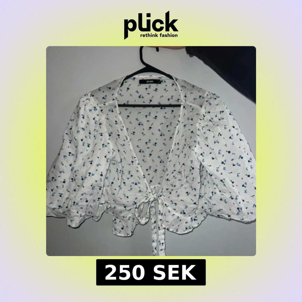 Supersöt vit blus med små blå blommor, volangdetaljer och knyt framtill. Blusen har trekvartsärmar och är croppad, perfekt för vår och sommar. Tunn och luftig i bomullsmaterial.