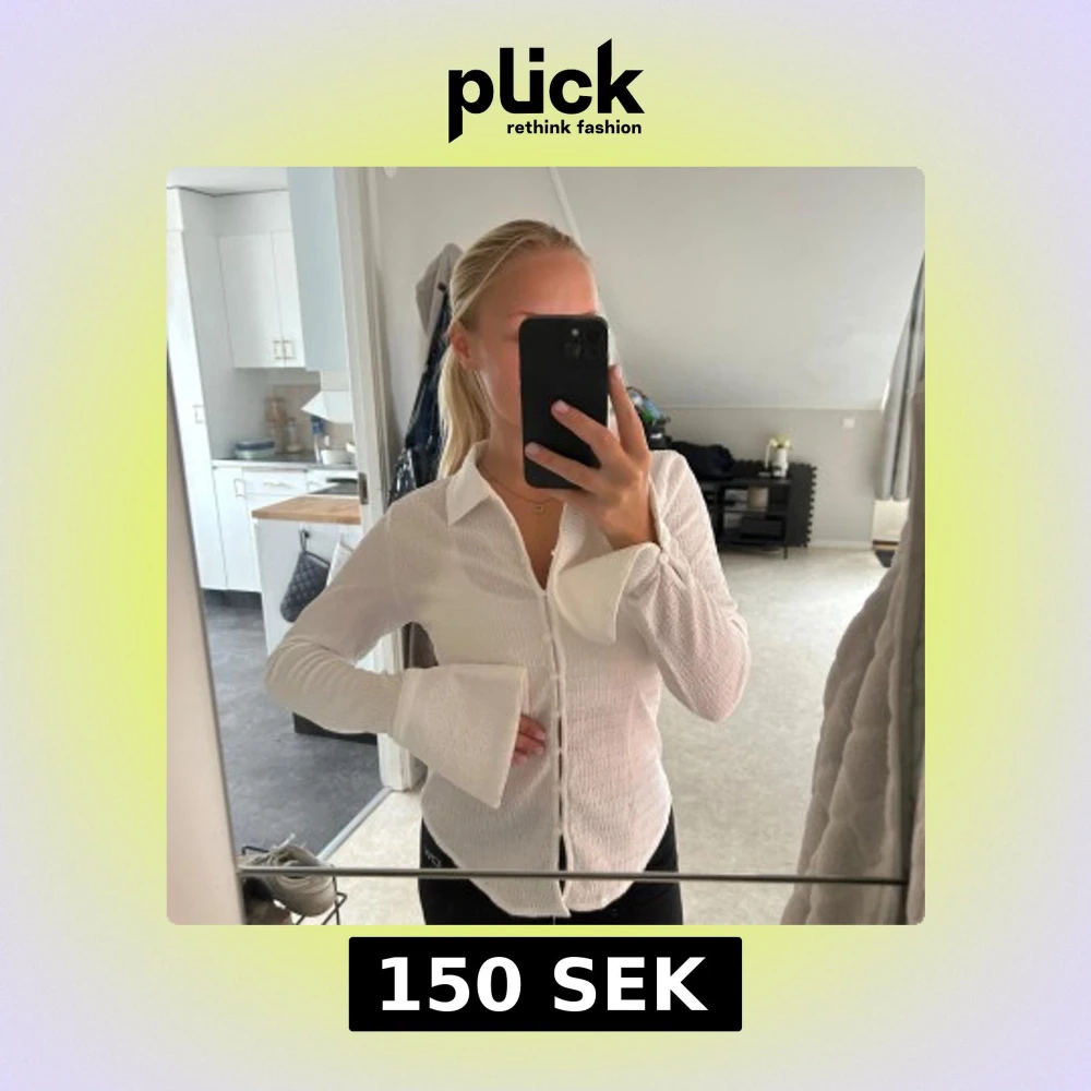 Säljer en vit skjorta/blus från Bik Bok i storlek S. Skjortan/ blusen har en krage, knappar framtill och är tillverkad i ett strukturerat bomullstyg. Ärmarna är långa och har extra vida muddar💕