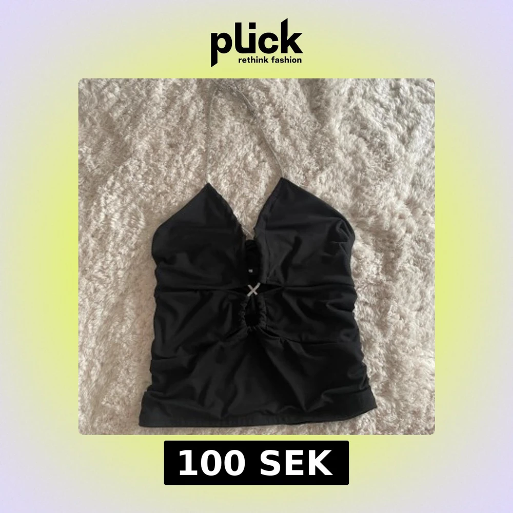 Supersnygg svart halterneck topp från Bikbok med glittriga silverband som knyts runt halsen och dekorativa strassdetaljer framtill. Toppen har omlott-design och cut-outs med X-formade strassdetaljer som ger en extra glam känsla. Perfekt för att sticka ut på kvällen!