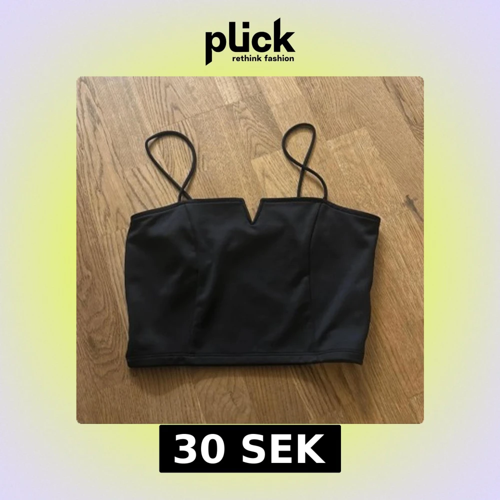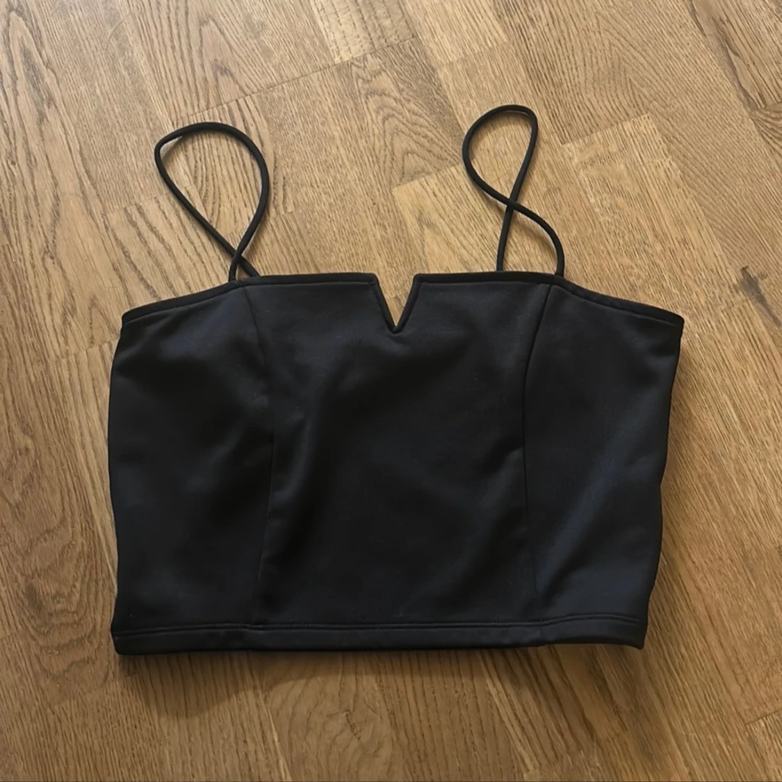 Snygg svart topp med smala axelband och en cool V-ringad detalj framtill. Croppad passform som ger en stilren look. Perfekt att matcha med höga jeans eller kjol för en trendig vibe.