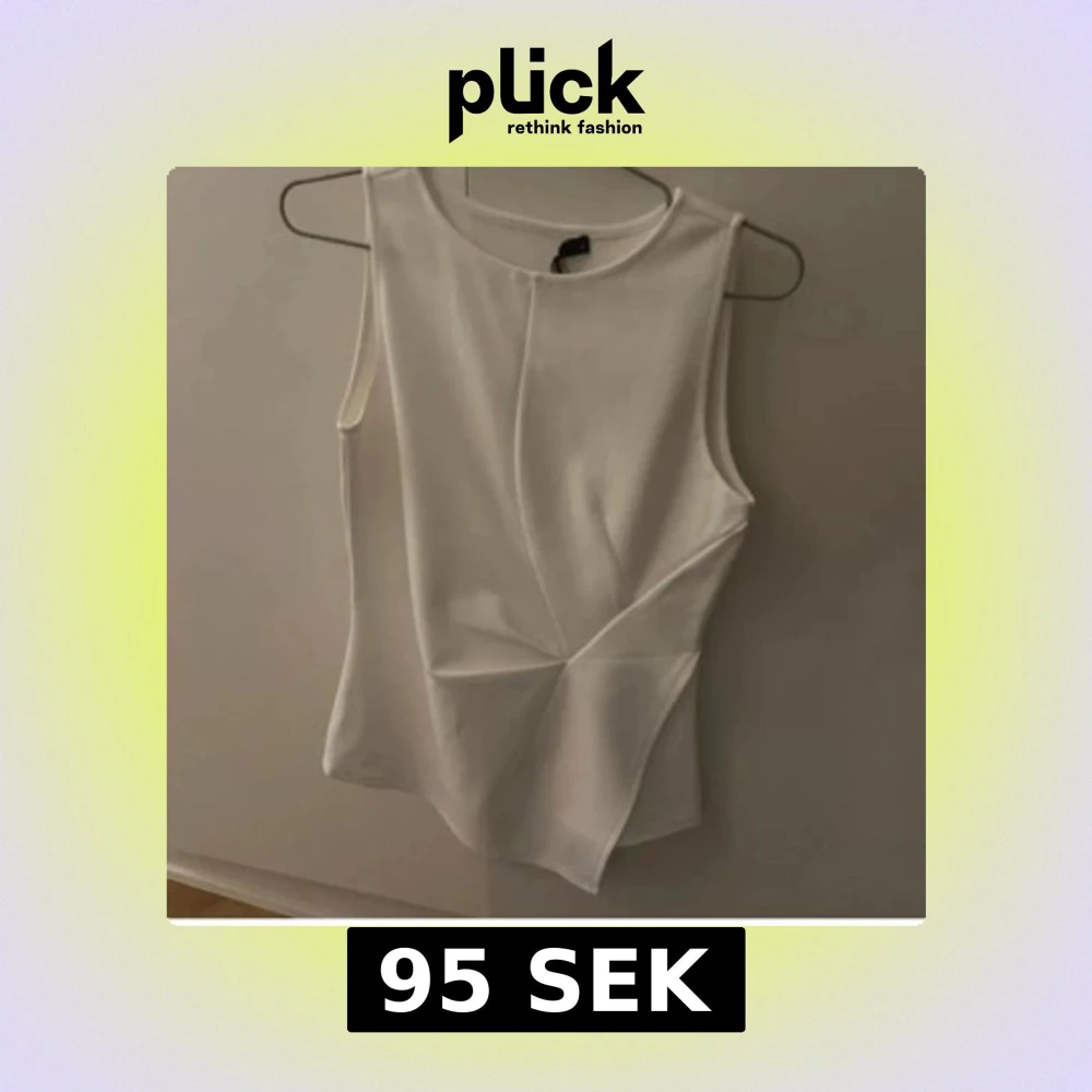 Säljer en stilren vit ärmlös topp från Bikbok i storlek S. Toppen har en asymmetrisk skärning och coola veckdetaljer framtill som ger en modern look. Perfekt att matcha med jeans eller kjol för en clean och trendig outfit.