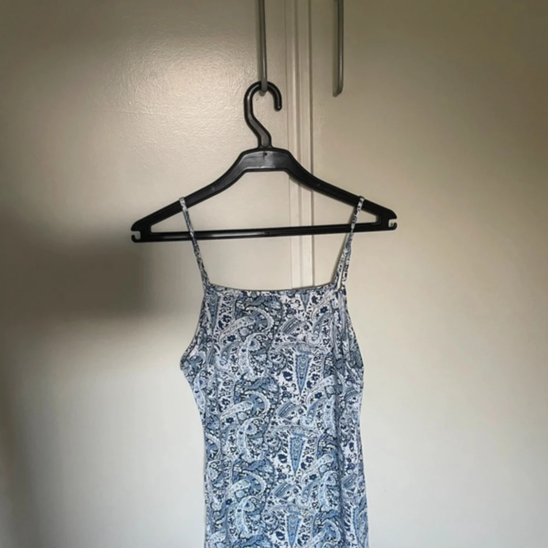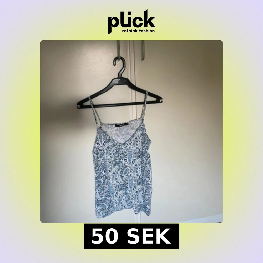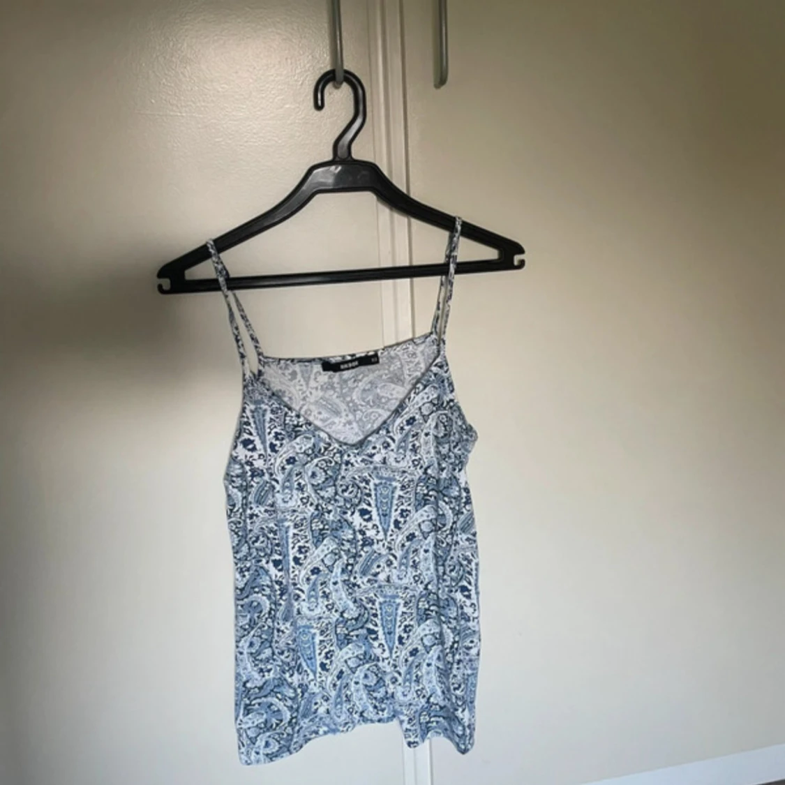 Säljer en snygg linnetopp med tunna axelband och paisley-mönster i blått och vitt. Toppen har en v-ringad front och ärmlös design, perfekt för varma dagar. Materialet är mjukt och lätt, troligen bomull eller polyester. Supersnygg till jeans eller shorts!