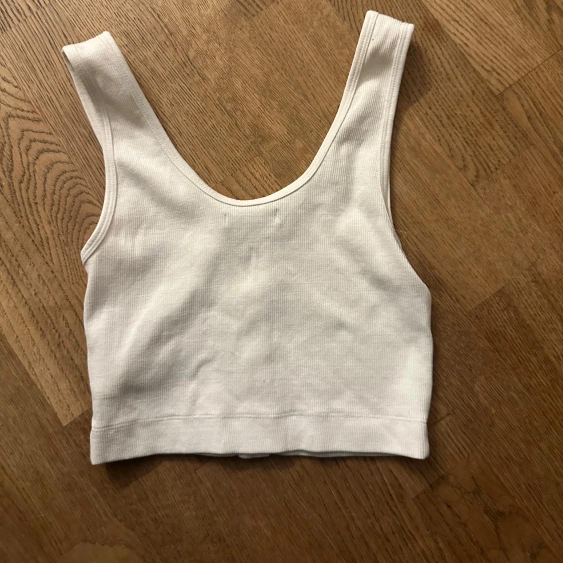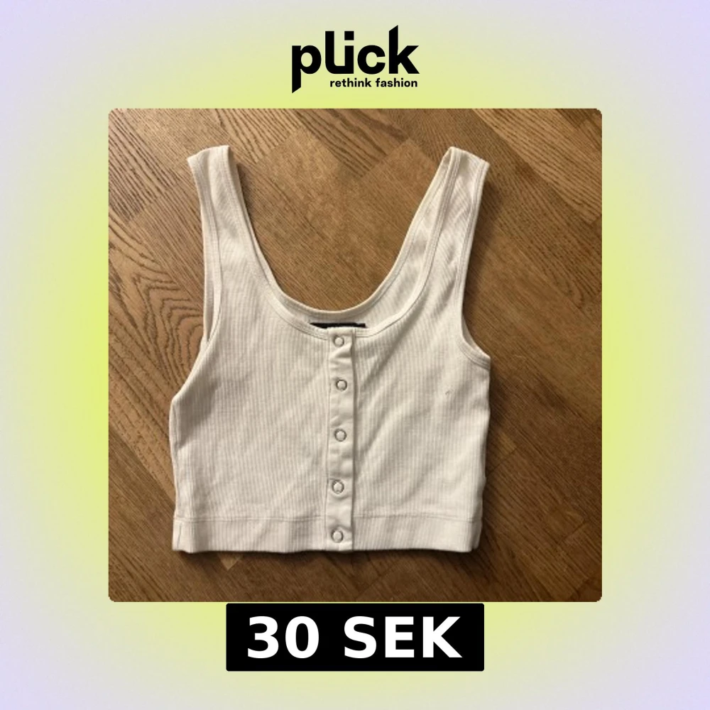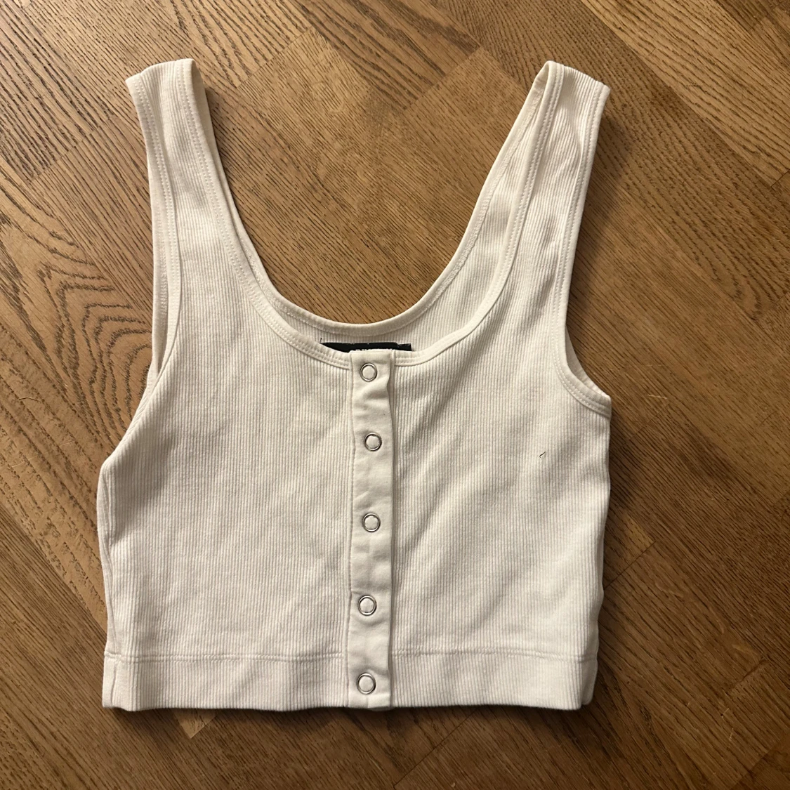 Säljer en vit topp i ribbad med croppad passform. Toppen har breda axelband och knappar framtill som ger en chill vibe. Perfekt att styla med jeans eller shorts för en enkel look.