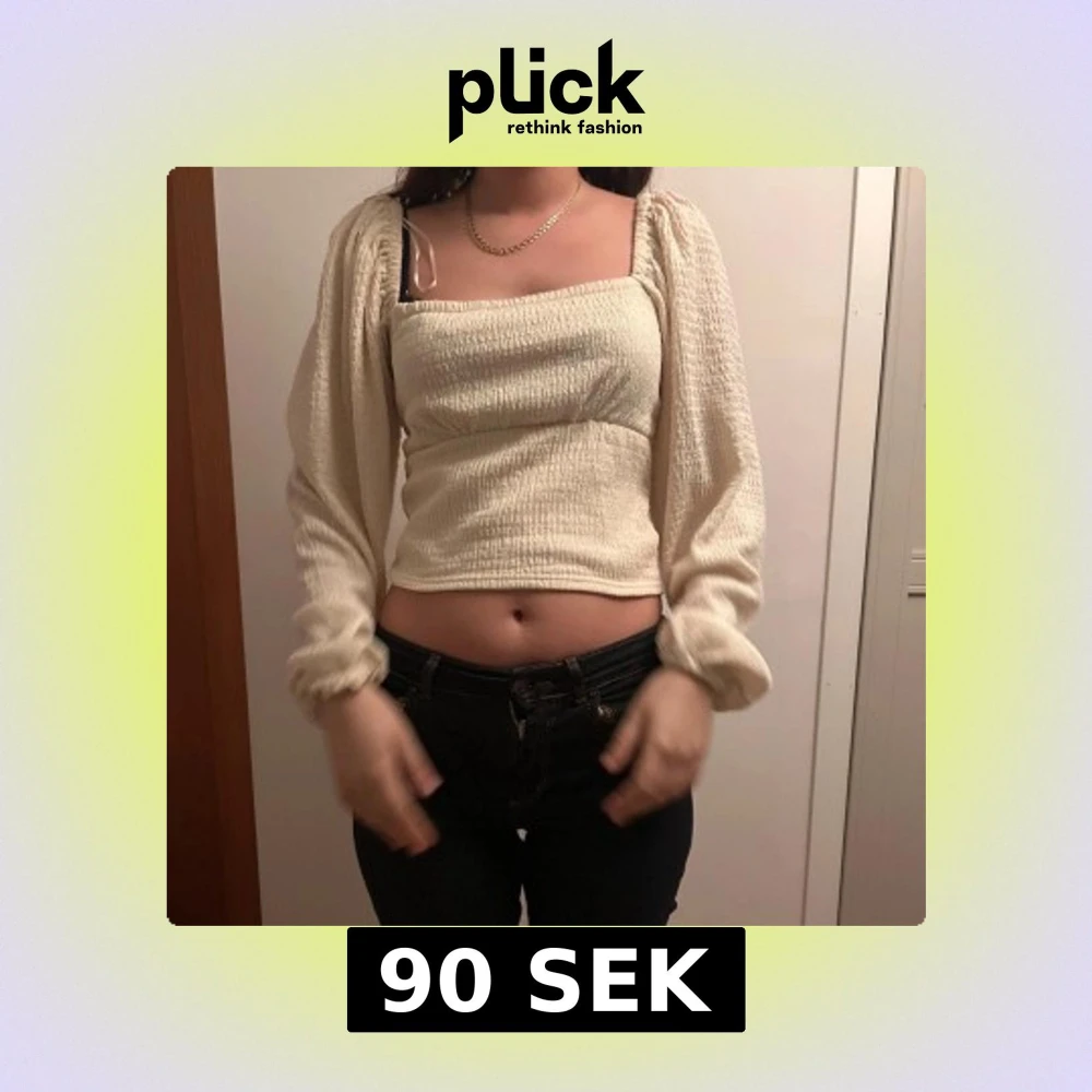 Säljer en krämvit blus med fyrkantig halsringning och långa puffärmar. Toppen är croppad och har ett smockat, ribbat tyg som ger en snygg struktur. 🥰🥰