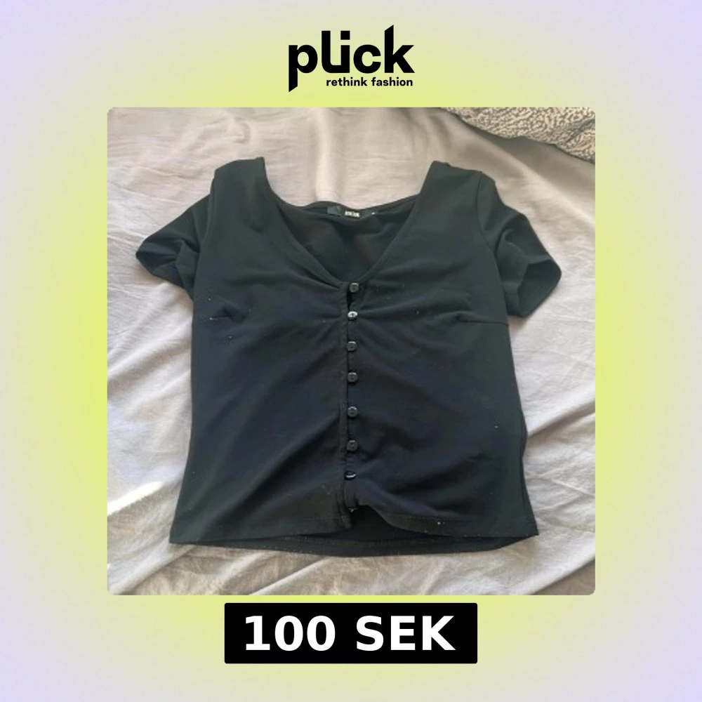Säljer en svart kortärmad topp från Bik Bok med knappar framtill och v-ringning. Perfekt för en stilren look.