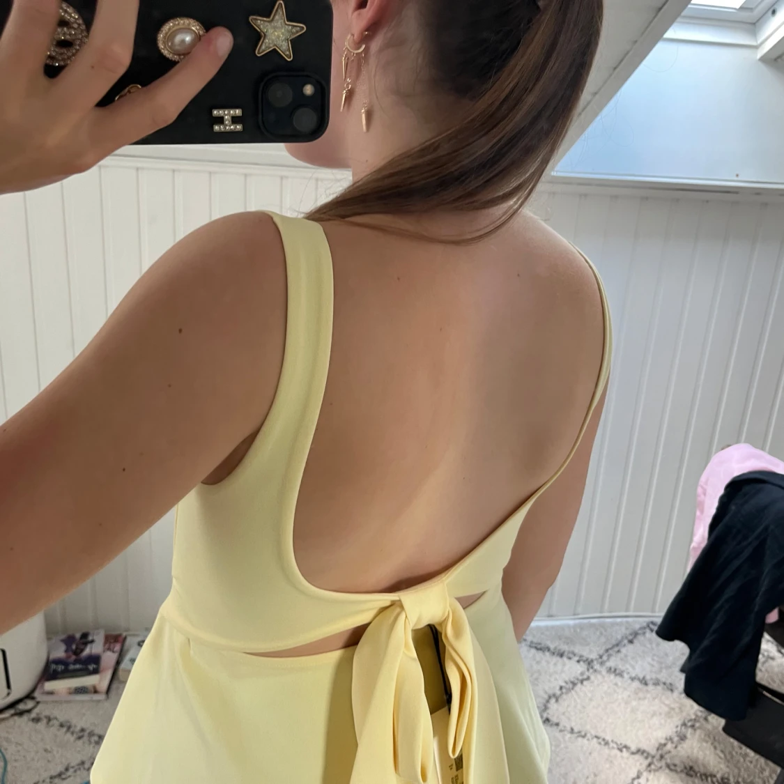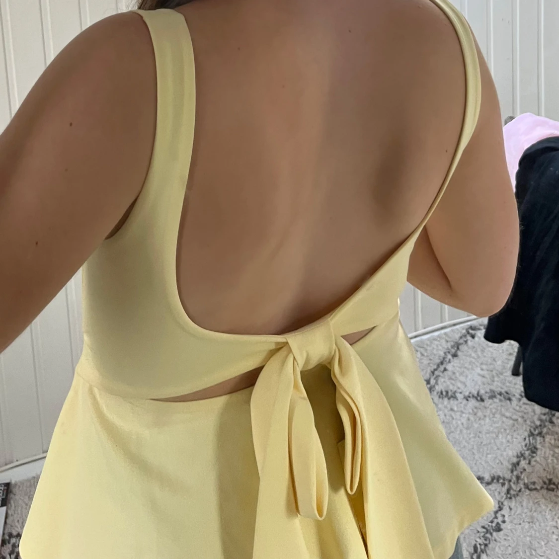 Superfin ljusgul top med breda axelband och fyrkantig ringning. Toppen har öppen rygg med snygg knytrosett och är tillverkad i ett mjukt, stretchigt material. Perfekt för sommarens alla tillfällen och lätt att styla med jeans eller kjol. Pris kan diskuteras!