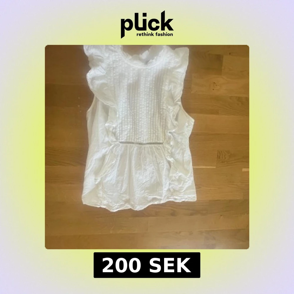 Supersöt vit blus från BikBok med volangdetaljer längs axlarna och sidorna. Ärmlös modell med rynkade partier och dekorativa sömmar framtill. Perfekt för en fräsch och somrig look, lätt och luftig i bomull.