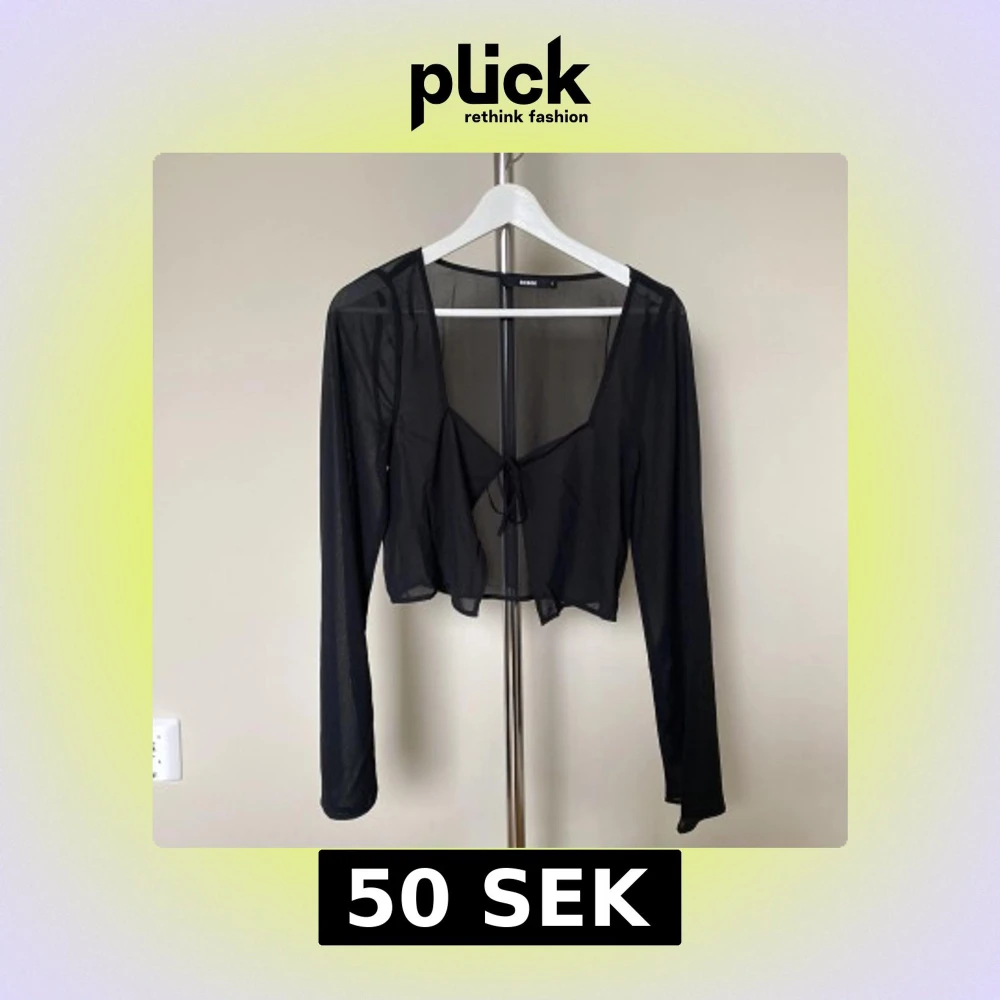 Säljer en svart transparent meshblus från Bik Bok med långa ärmar och knyt framtill. Blusen är croppad och har en djup v-ringning, perfekt att styla över ett linne eller bralette. Lappen borta men aldrig använd.