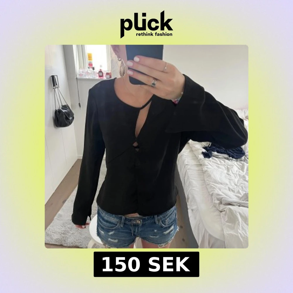 Säljer en svart långärmad blus med unik asymmetrisk knäppning framtill. Blusen har en djup v-ringning och är tillverkad i ett mjukt, slätt material. Perfekt för dig som gillar stilrena och moderna plagg. Har även slits i ärmarna perfekt fest topp