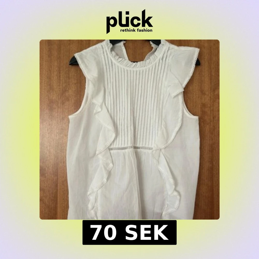 Supersöt vit blus från Bikbok med volangdetaljer längs axlar och framsida. Blusen är ärmlös och har fina veck framtill samt en liten volangkrage. Perfekt för dig som gillar romantisk och luftig stil. Gjord i tunn bomull som känns lätt och fräsch.
