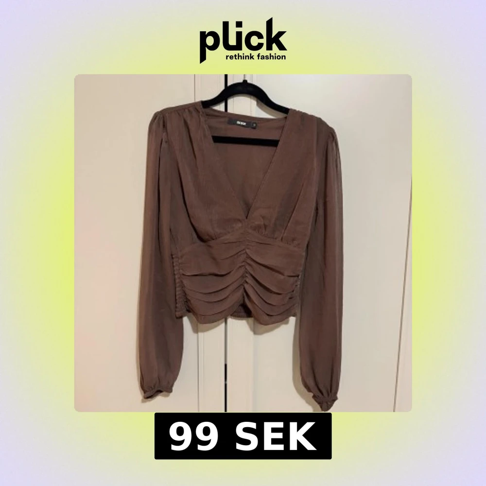 Snygg brun blus från Bik Bok med v-ringning och långa ärmar. Blusen har en smickrande rynkad detalj framtill och elastisk midja för en bekväm passform. Perfekt för både vardag och speciella tillfällen.