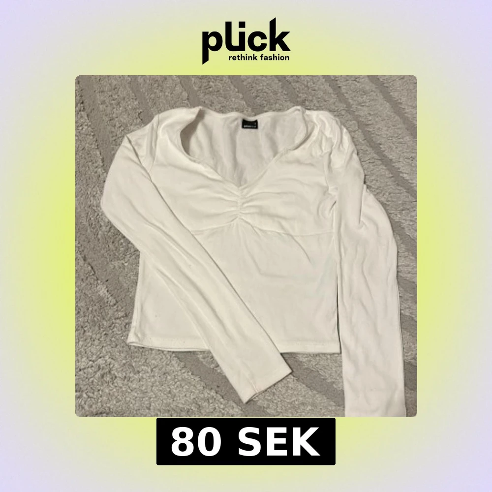 Snygg vit långärmad topp från Bik Bok med croppad passform och v-ringning. Toppen har en lätt rynkad detalj framtill som ger en cool touch. Perfekt att matcha med jeans eller kjol för en trendig look.