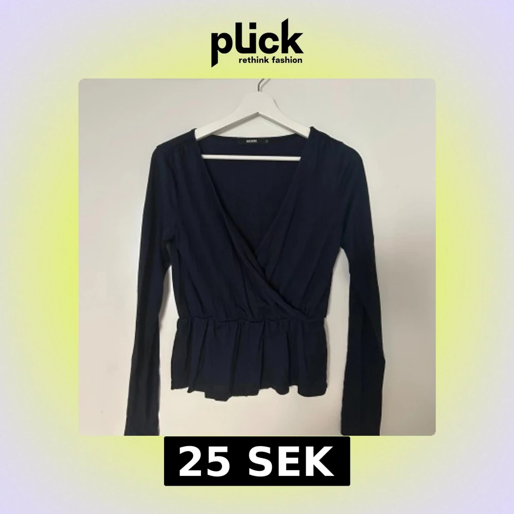 Snygg marinblå omlottopp från Bik Bok med långa ärmar och v-ringning. Toppen har en markerad midja och volangkant nedtill som ger en feminin siluett. Perfekt att styla med jeans eller kjol för en trendig look.