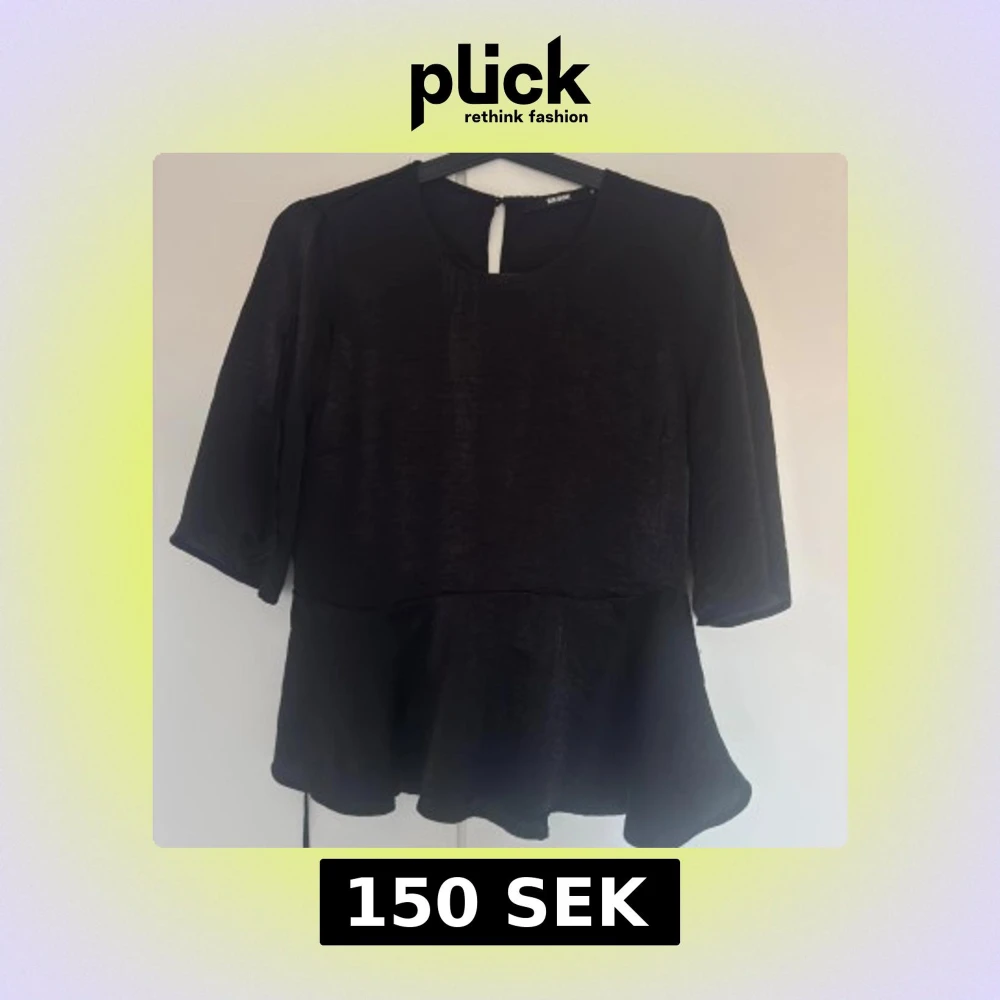 Säljer en svart blus från Bik Bok med rund halsringning och trekvartsärm. Blusen har en volang nertill som ger en snygg siluett och en liten öppning med knapp i nacken. Materialet är lätt glansigt och känns mjukt mot huden.