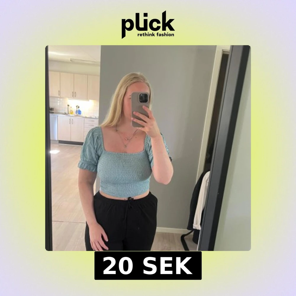 Säljer en ljusblå croppad topp med smockad midja och puffiga korta ärmar. Toppen har fyrkantig ringning och kan bäras både med axlarna uppe eller offshoulder. Storlek s, från bikbok