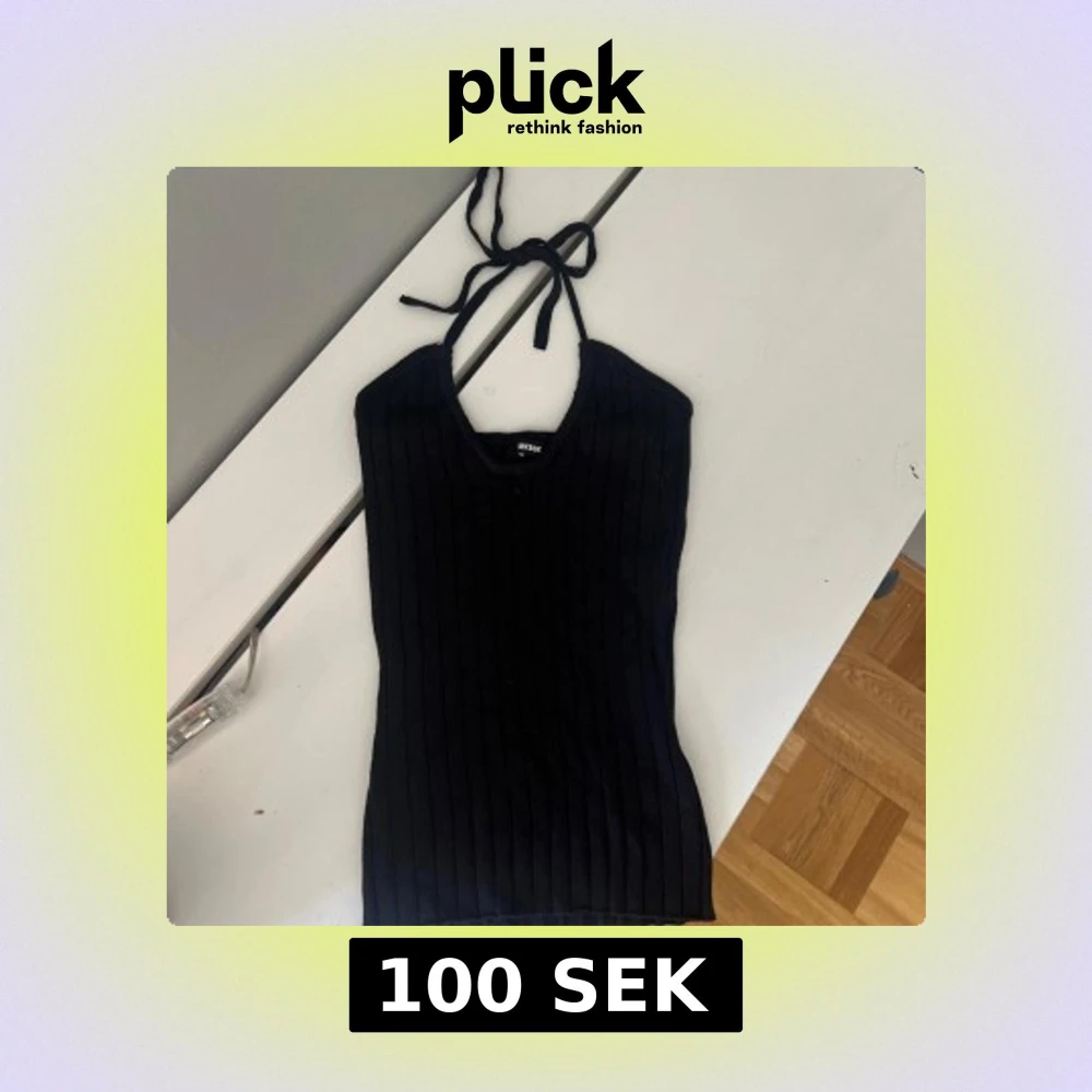Säljer en svart ribbad halterneck linnetopp från Bik Bok. Toppen har knyt i nacken och är ärmlös med en tight passform💞