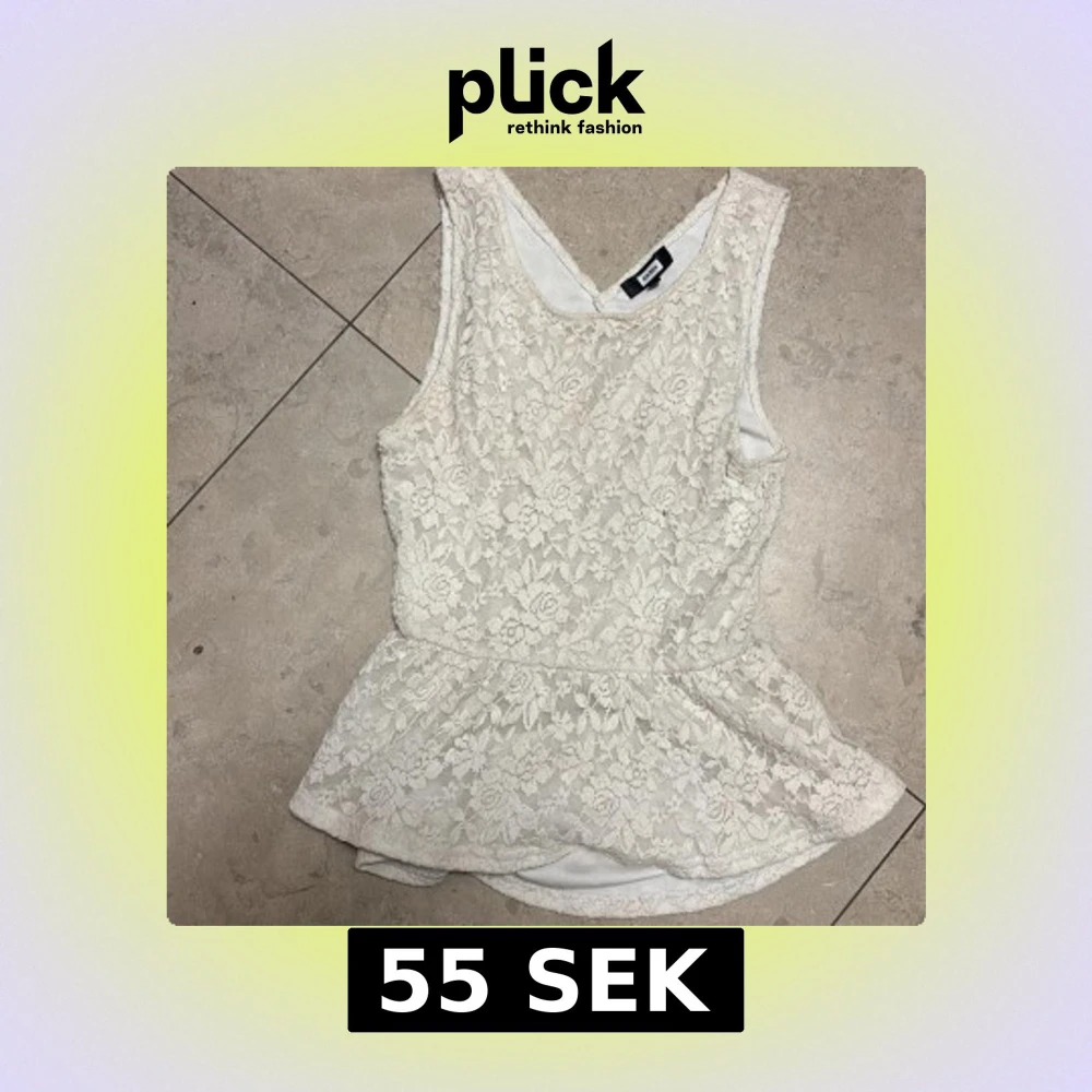 Superfin vit blus från BikBok i spets med blommigt mönster. Toppen är ärmlös, har peplumvolang och en snygg omlott med öppen rygg. Perfekt för dig som gillar romantisk och trendig stil. Fodrad under spetsen för extra komfort. Är i storlek m men skulle mer säga att den är en xs/s
