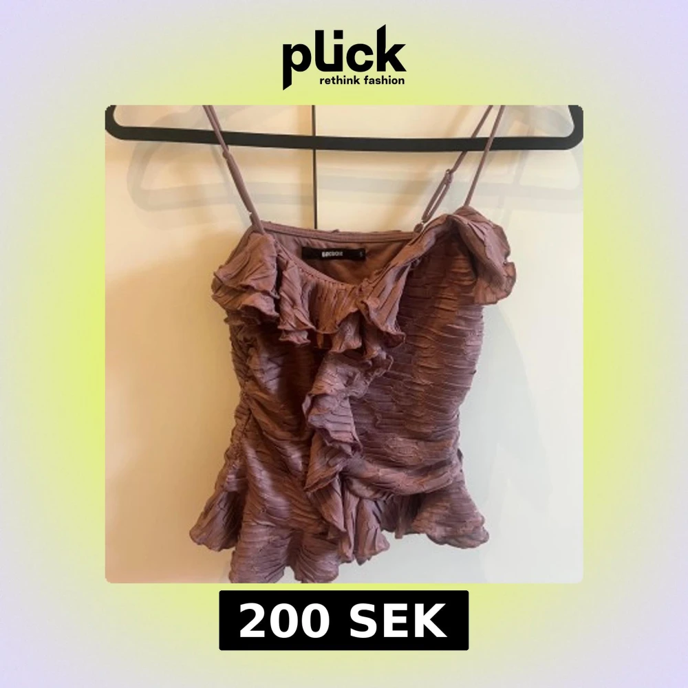 Supersöt lila linnetopp från Bik Bok med volanger och plisserad struktur. Smala axelband och en flowy, feminin look som passar perfekt till jeans eller kjol.