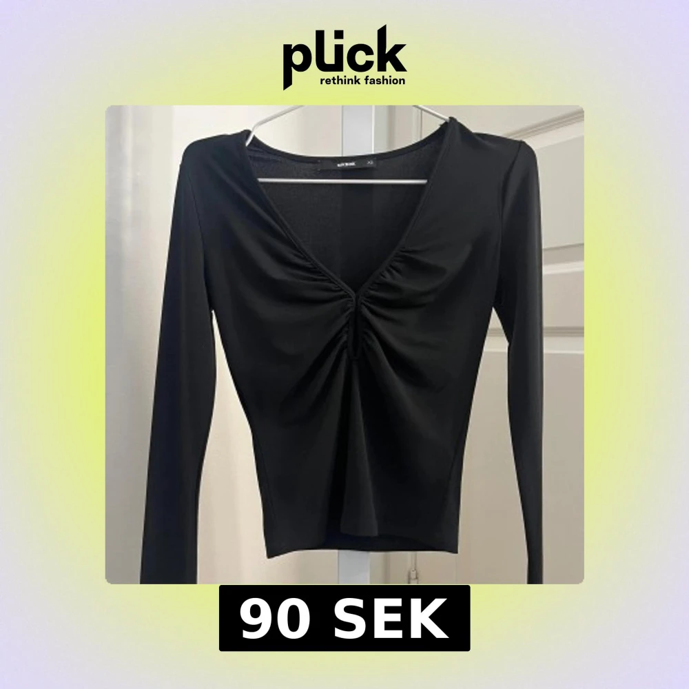 Säljer en svart långärmad topp från BikBok med snygg v-ringning och rynkdetalj framtill. Toppen är figurnära och tillverkad i ett stretchigt syntetmaterial. Perfekt att styla med jeans eller kjol🌺