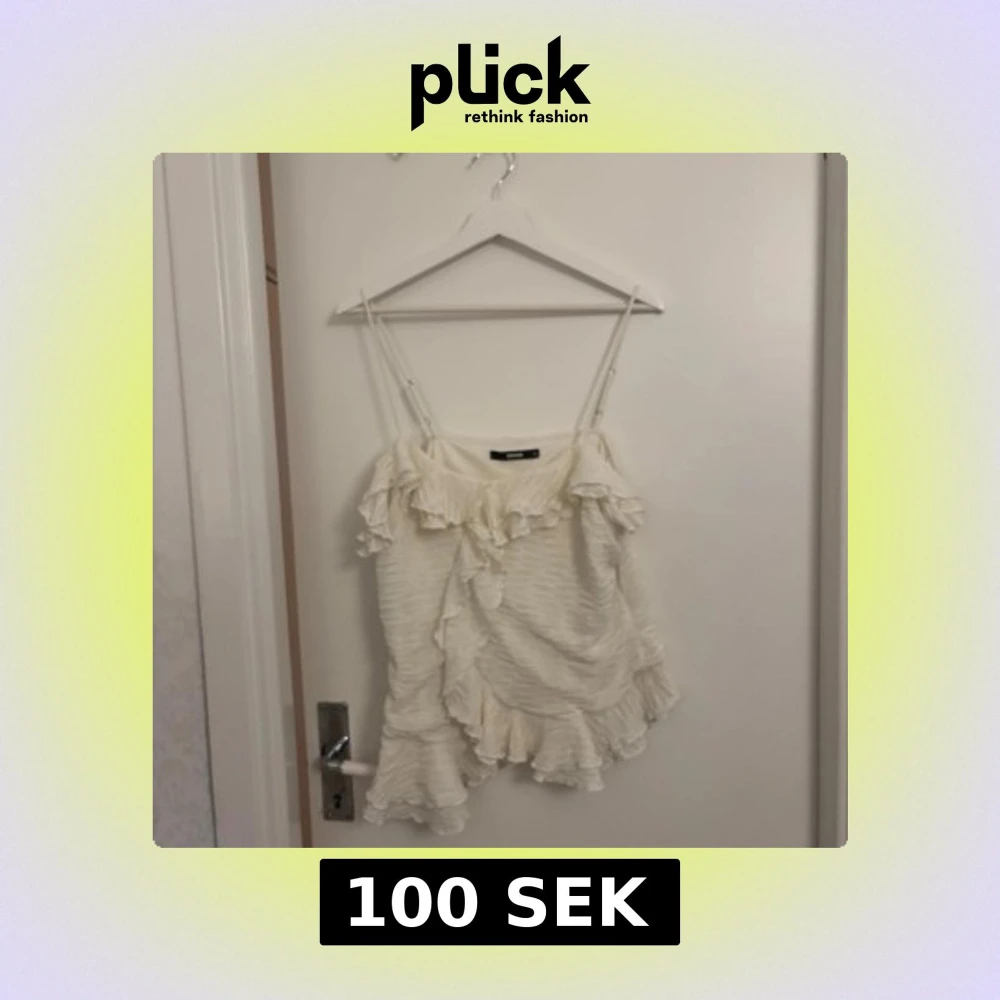 Supersöt vit topp från Bik Bok med smala axelband och volangdetaljer både upptill och nertill. har en lätt rynkad struktur och känns riktigt somrig och luftig. Perfekt för dig som gillar romantisk och feminin stil.
