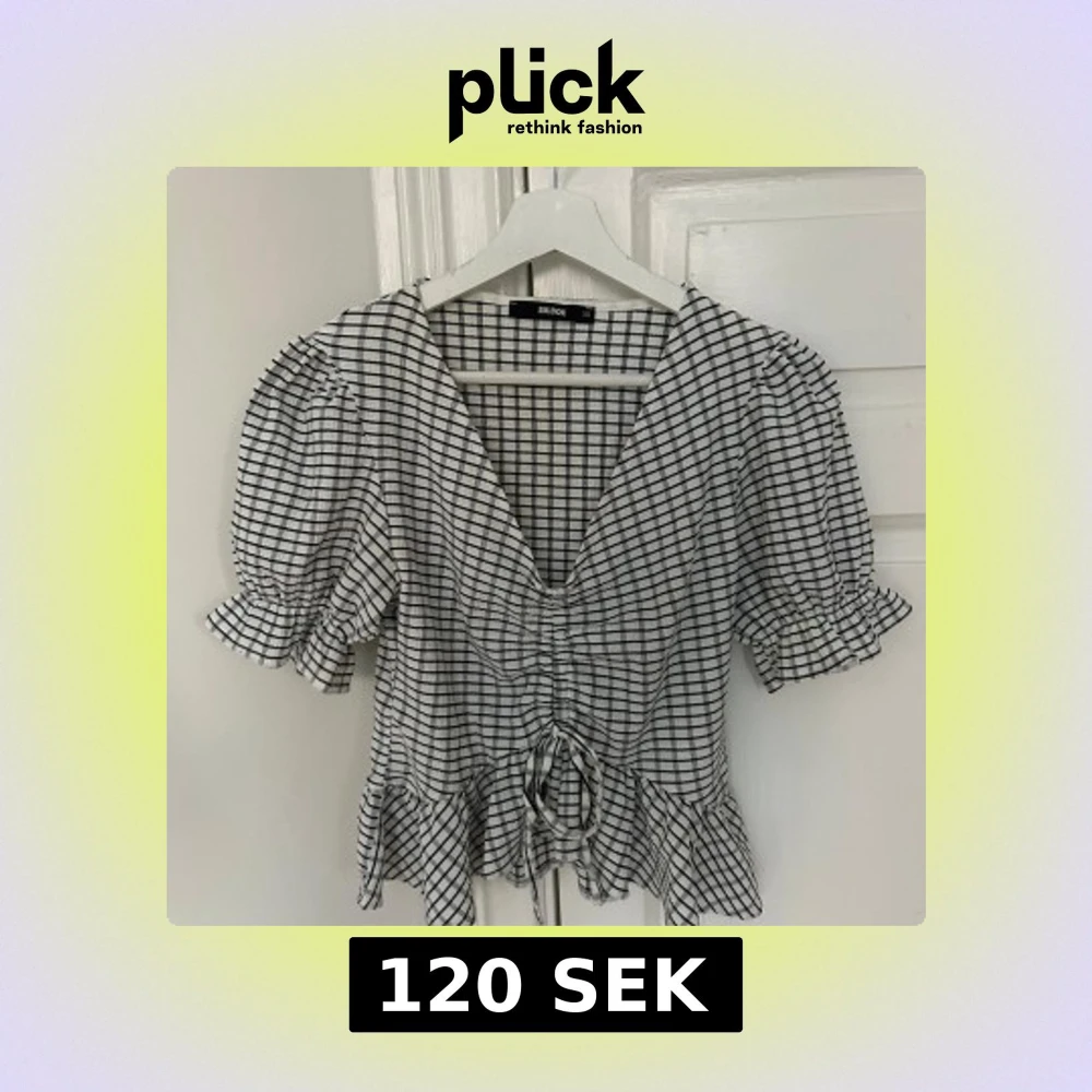 Säljer en söt rutig blus från Bik Bok i svart och vit. Blusen har korta puffärmar och en v-ringad design med knytning framtill. Använd 1 gång. Priset kan diskuteras vid snabb affär😊
